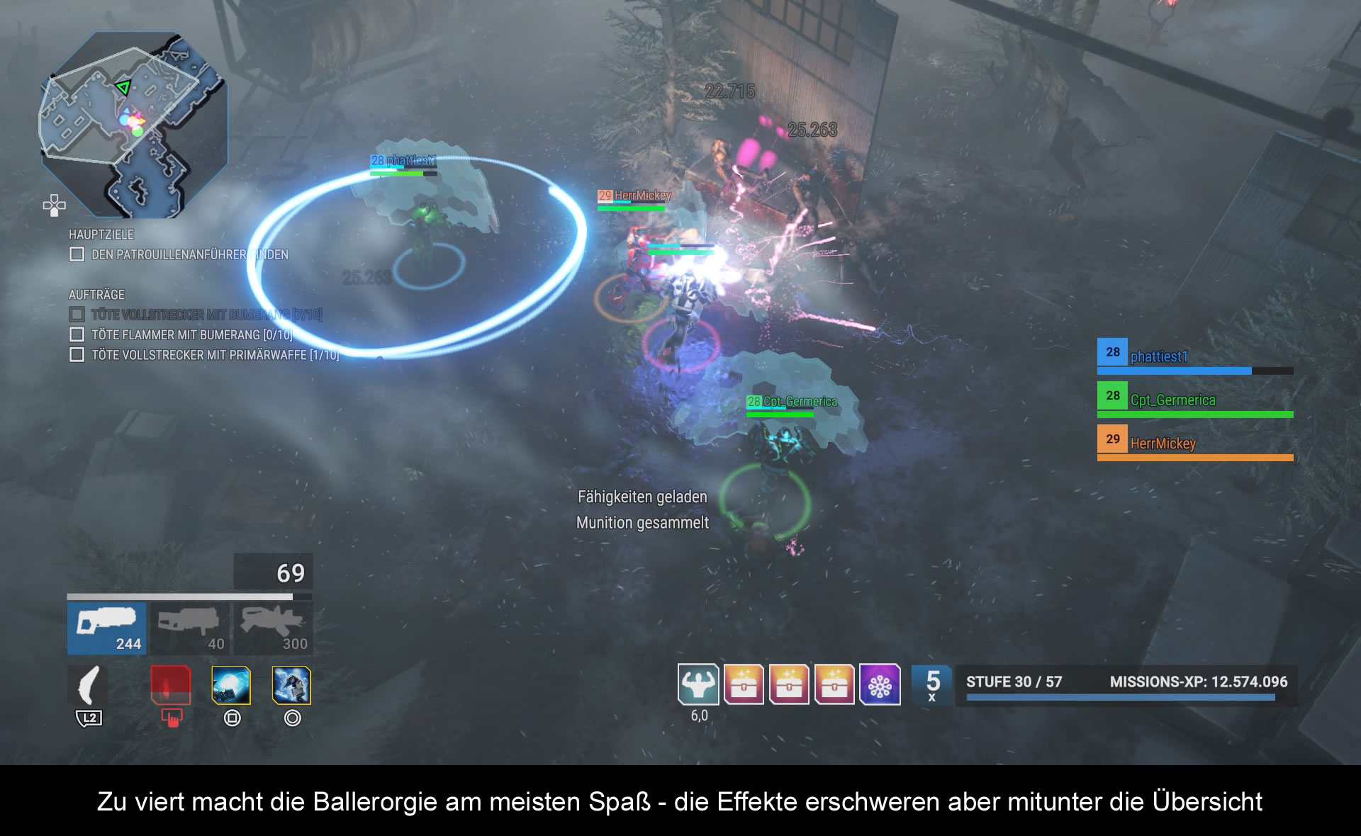 Das Matchmaking funktioniert sehr gut und bietet eine Drop In und eine Drop Out Funktion. Hat man einen Trupp gefunden spielt man die Missionen, die der Host aussucht einfach weiter – automatisch wird die Mannschaft nicht aufgelöst. Später wird es aber schwer, geeignete Mitspieler zu finden, steigt man unterlevelt in eine Runde ein, gibt’s zwar viele Erfahrungspunkte und Loot, aber Spaß macht die Ballerei dann kaum, denn gegen die härteren Gegner hat man selbst keine Chance. Andersrum ist es auch nicht besser, denn dann wird’s öde. Am besten man findet Mitspieler die ungefähr auf dem gleichen Level sind. Dann kommt Laune auf, denn im Team alles und jeden in Grund und Boden zu ballern, fetzt einfach nur. Neben zusätzlicher Feuerkraft können Mitspieler einen auch wiederbeleben, ansonsten geht’s beim letzten Checkpoint weiter. Alleine kann man zwar auch durch die Levels rennen, dann stirbt man jedoch viel schneller, vor allem bei den Horde-Events. Also besser im Team das Ganze angehen! Schade ist nur, dass es keinen Couch Coop gibt, denn so ein Spiel hätte von einem Offline Multiplayer wirklich profitiert. Verzichtens wert ist dagegen der PvP Modus, bei dem man in andere Spiele eindringen kann (umgekehrt auch möglich) und gegen den anderen Krieger kämpft. Diese Funktion kann man gottseidank auch deaktivieren. Neben den Missionszielen auf den mitunter großen Karten gibt es auch zahlreiche zufallsgenerierte Events: Zwischenbosse wollen eliminiert, Herausforderungen bestanden und UFOs geplündert werden. Genug zu tun gibt es also, wer nur stur durch die Levels rennt, verpasst die Hälfte.