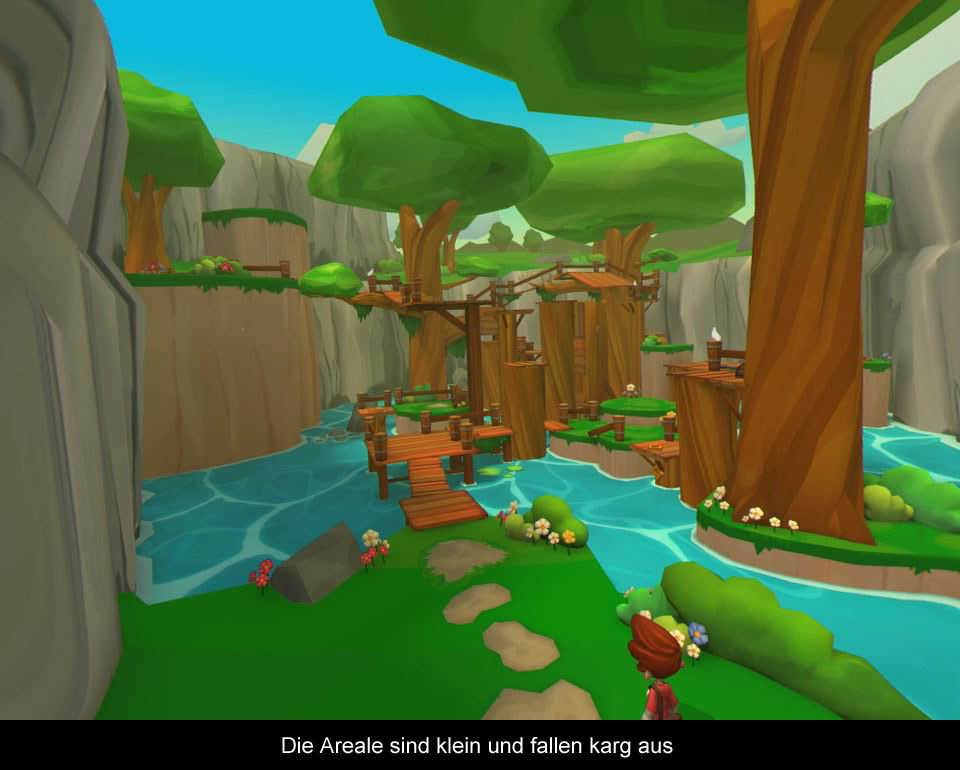 “Along Together” ist dabei voll und ganz auf die jüngere Zielgruppe zugeschnitten, denn bis auf zwei oder drei vielleicht anspruchsvollere Rätsel hat man das Adventure im Nu in locker zwei Stunden durchgespielt. Meist läuft man von einem Schalter zum nächsten drückt diesen, oder platziert eine Kiste darauf. Selbst wenn man mehrere Mechanismen gleichzeitig betätigen muss, kommt man nicht wirklich ins Schwitzen. Kurz probiert, eine Reihenfolge geändert und der Weg war frei. In der letzten Sequenz kommt es übrigens zu einer mini klitzekleinen “Action”szene, wo man sich da fragt, warum es nicht mehr solche Einlagen im Spiel gegeben hat. Auch das Teamwork mit Hund Rishu wird viel zu selten in Anspruch genommen. Und warum wird im Banner eine Fahrt mit einer Lore gezeigt, welche im Spiel nicht zu finden ist? Das wäre nämlich mal cool gewesen. Hinzu kommt, dass es zwar etliche Spielzeuge zum Einsammeln gibt, diese jedoch meist nicht sonderlich gut versteckt sind. Ein um die Ecken schauen wie noch bei “Moss” oder “Wayward Sky” fällt somit flach und überhaupt bietet der Titel wenig VR Feeling und hätte ohne weiteres auch auf dem normalen TV funktioniert. Dies liegt auch an der Grafik, welche technisch gesehen zwar scharf, flimmerfrei und farbenfroh daherkommt, jedoch so gut wie gar nichts auf dem Bildschirm passiert. Die Level sind steril und bis auf ein paar sehr wenige Vögel und Fledermäuse ohne Leben. Da weht kein Baum im Wind, da krabbeln keine Lebewesen durchs Bild, es gibt keine animierten Objekte in den Levels usw. Das höchste der Gefühle ist noch eine Sternschnuppe am Himmel und wohl auch nur, weil es dafür eine Trophäe gibt. Die Suche nach Rishu wird auch ohne weitere Storysequenzen über die Bühne gebracht, was der Spannung nicht gerade zuträglich ist und man einfach nur ohne große Anreize durch das Spiel rennt. Die musikalische Untermalung löst ebenfalls keine Jubelstürme aus und bietet nur unverständliche Fantasiesprache mit immerhin deutschen Texten.