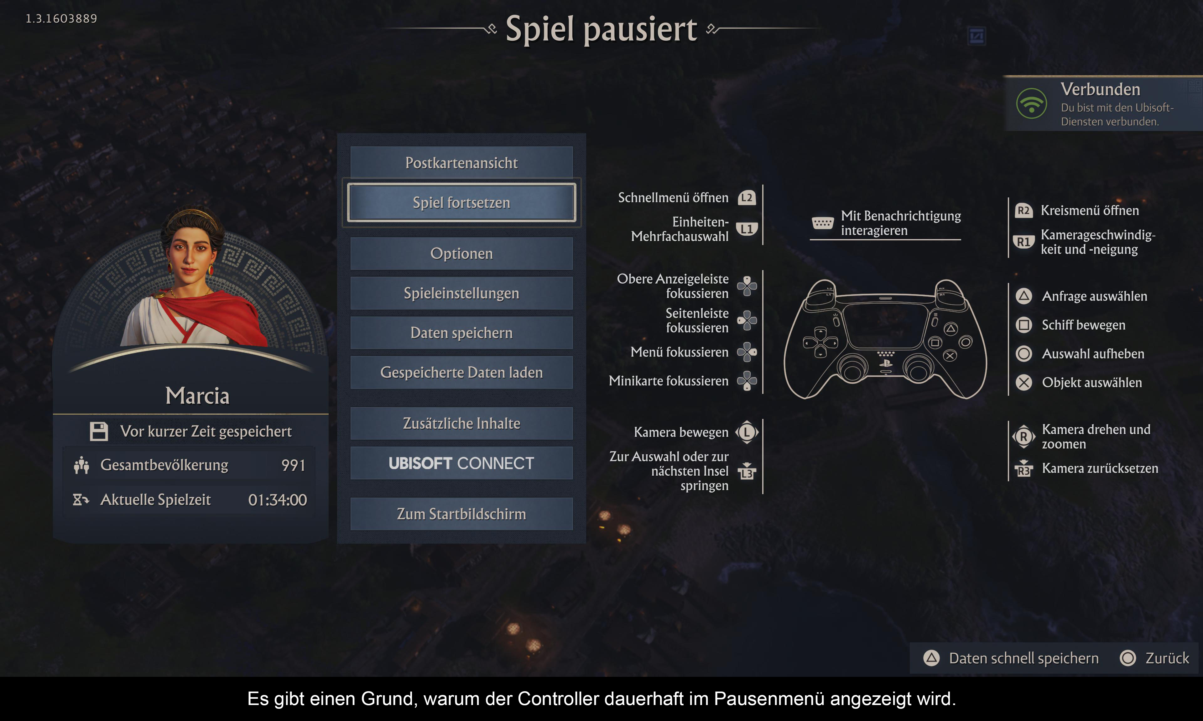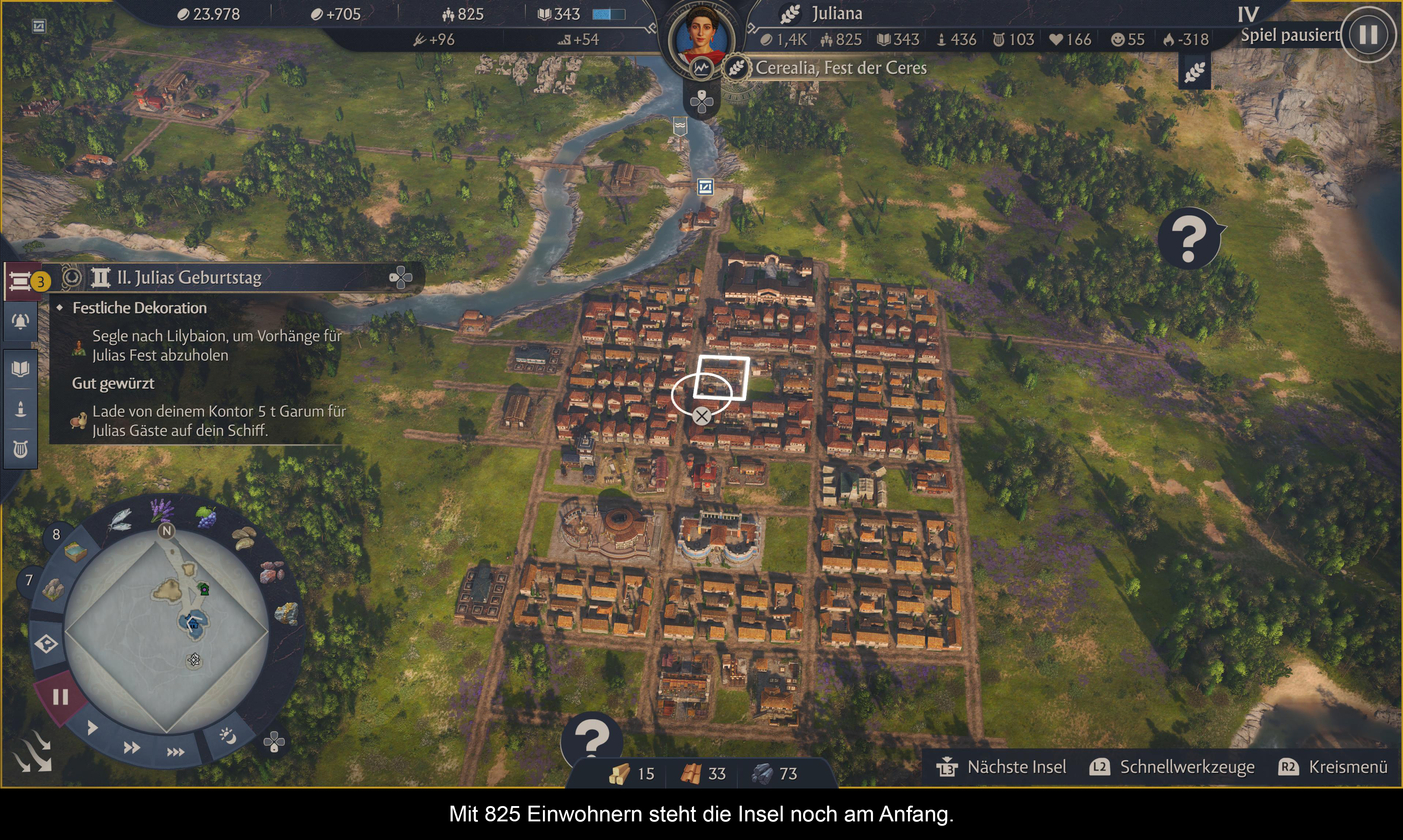 Was die Steuerung betrifft, kann ein PS5 Controller nicht mit einer Maus und Tastatur Kombination mithalten. Auf den ersten Blick scheint einem die Steuerung zu erschlagen und die Controller Erklärung wird aus gutem Grund im Pause Menü angezeigt. Wenn man aber das Grundsystem erstmal versteht, eröffnet sich ein überraschend flüssiges Erlebnis. Die wichtigsten Tasten sind L2 und R2. Bei L2 öffnet sich ein Quickmenü welches alle Basis Befehle hat um schnell Strukturen zubauen, verschieben oder zu bearbeiten. Wer will, kann hier die Befehle sogar individuell belegen. Bei R2 öffnet sich das Bau und Truppenmanagment Menü. Bei Bauen kann man mit L1/R1 durch die verschiedenen Gebäudetypen und Bevölkerungen durschalten. Danach wird wieder über ein Rad Menü gewählt. Man wählt das zu erzeugendes Produkt aus und findet in einem separaten Fenster die dazugehörenden Gebäude. Mit dem Steuerkreuz wählt man diese aus und platziert sie. Das es derart einfach geht, ist der neuen Umstrukturierung des Bausystems zu verdanken. Dies macht es selbst auf Konsolen einfach schnell und unkompliziert die Anno typischen Warenketten zu positionieren. Mit Kopieren (L2) lassen sich schnell mehre Typen dann positionieren. Auch das Straßennetz ist schnell gebaut, da es Strukturen automatisch erkennt und nun auch diagonal bauen kann. Leider ist die Auswahl der verschiedenen Schiffe und Truppen nicht so gut gelöst. Dies ist sehr fummelig. Auch hier merkt man, dass der Kampf nicht unbedingt das Hauptaugenmerk ist.