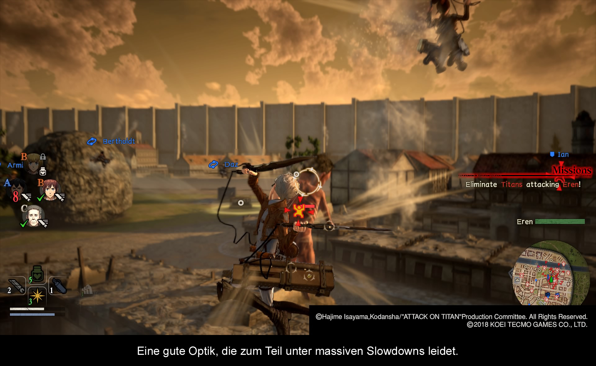Die Story von Attack on Titan ist allgemein bekannt. Es geht darum große, nackte Monster zu töten, um das Überleben der Menschheit zu sichern. Zur Bekämpfung dieser abstrusen Figuren hat die Menschheit das sogenannte ODM (Omni-directional mobility Gear)-System entwickelt, welches dem Benutzer fantastische Mobilität garantiert, um sich durch die Stadt als auch um die Titanen herum zu bewegen. Am ehesten lässt es sich mit Spider-Mans Spinnenweben vergleichen, mit denen er sich durch New York bewegt. Zwar hat es ein wenig gedauert bis ich die Nutzung des ODM vollends begriffen hatte, doch nach einer kurzen Aufwärmphase ist es mir relativ schnell gelungen, gekonnt durch die Gegend zu fliegen, und einen Titanen nach dem Nächsten zu erledigen. Das Töten von Titanen, welches das A und O des Spiels ist, verläuft stets nach dem gleichen Muster ab. Zunächst wählt man mit dem rechten Analogstick den Schwachpunkt des Titanen aus (der direkt unter dem Hinterkopf liegt), ehe man mit dann mit der Dreieck-Taste seinen schwingenden Angriff aus der Luft durchführt. Das Spiel bietet einem aber auch die Chance an, wichtige Gegenstände zu erschließen, indem man bestimmte Körperteile erwischt, die mit einem kleinen Item-Logo gekennzeichnet sind. Diese Items kann man dann im Anschluss dafür nutzen, um seine Waffen als auch seine ODM-Geräte zu verbessern. Alles in allem war ich sehr überrascht, was den Tiefgang des Gameplay angeht. Im Laufe der ersten 10 Stunden bringt einem das Spiel zahlreiche neue Features bei, wie zum Beispiel Partnerangriffe, mit denen man seine Kollegen auffordern kann, Titanen anzugreifen und sogar ein kleines Base-Building-System, mit dem man weitere Basen aufbauen kann, die entweder dazu dienen, sein Item-Repertoire aufzufüllen, oder die Titanen anzugreifen. Darüber hinaus ist das Spiel in zwei Perioden unterteilt. Während es in der Angriffsphase darum geht, innerhalb von verschiedenen Missionen so viele Titanen wie möglich zu erledigen, gibt es auch noch ruhigere Phasen, wo es darum geht mit den anderen Charakteren zu interagieren und sie noch besser kennenzulernen. Ein bisschen wie „Persona“, aber ohne den selben Tiefgang. Mir persönlich hat dieser Wechsel zwischen ruhigen und spannenden Perioden sehr gefallen, da das ewige Metzeln irgendwann doch ein wenig eintönig wird. Wer jedoch nicht genug vom Schnetzeln bekommen kann, wird sich über einen umfangreichen Multiplayer-Modus freuen können. Hier kann man entweder gemeinsam die verschiedenen Scout-Missionen spielen, oder im Rahmen eines Wettkampfes herausfinden, welchem Team es gelingt innerhalb einer gewissen Zeit so viele Titanen wie möglich zu erledigen. Der Fortschritt, der in diesem Modus erzielt wird, reicht auch zurück in die Singleplayer-Kampagne, was sowohl Items als auch Waffen umfasst. Der Multiplayer-Modus ist ein gelungenes Feature, welches (sofern die User verbleiben) einem lange nach Abschluss der Singleplayer-Kampagne unterhalten kann.