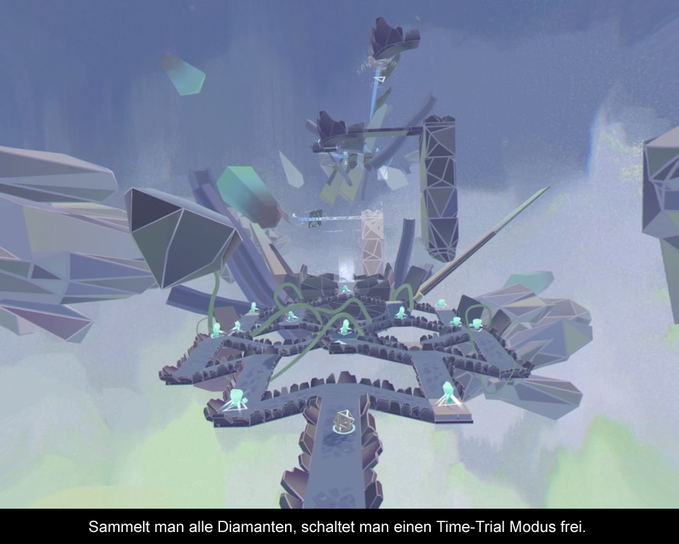 Ihr übernehmt die Rolle eines Jugendlichen Mädchens, welches in einer dystopischen Zukunft zu leben scheint und die Welt mit Müll verseucht ist. Auf einer Müllhalde kommt die kleine mit einem Artefakt in Berührung, welches einer VR Brille ähnelt. Natürlich setzt Sie die Brille auf und wird in eine Traumwelt teleportiert und verwandelt sich zudem in einen Ball. Fans von “Marble Madness” und “Super Monkey Ball” werden sich von nun an heimisch fühlen, denn unsere Aufgabe besteht darin, 25 Labyrinthe rollend zu durchqueren. Natürlich erwarten euch dabei allerlei Hindernisse, welche es zu überstehen gilt. Neben obligatorischen Abgründen, gibt es noch poröse Plattformen, sich drehende Brücken, Wippen, kleinere Schieberätsel und Sprünge zu meistern. Abseits der Hindernisse gibt es allerdings nicht viel zu tun, denn Gegner sucht man vergebens und nur ein paar Diamanten zum Einsammeln sorgen für zusätzliche Abwechslung. Hat man alle, nicht sonderlich gut verstecken, Diamanten in einem Level gefunden, wird ein Time Trail für dieses Level freigeschaltet. Hier gilt es dann die vorgegebene Zeit zu schlagen. Ein Onlinevergleich mit anderen Spielern ist allerdings nicht möglich. Die ersten 14 Level stellen den Spieler übrigens vor keine große Herausforderung, da alles noch recht übersichtlich daherkommt und die Bahnen und Plätze fast immer mit Banden versehen sind. Erst danach zieht der Schwierigkeitsgrad merklich an und man bekommt zusehends schwitzende Hände. Gerade zum richtigen Zeitpunkt, bevor das Spiel aufgrund des leichten Schwierigkeitsgrades und der einfachen Level Architektur langweilig wird. Allerdings bringt der komplexe Levelaufbau auch Probleme mit der Steuerung mit sich, womit wir den Bogen zu unserer Einleitung schlagen.
