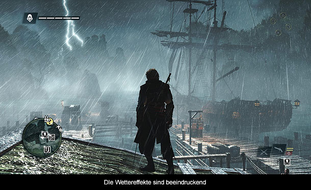 Assassin`s Creed IV: Black Flag ist eines der vielen PS4-Spiele zum Release, welches nebenbei auch noch auf der PS3 erscheint und glücklicherweise erhält man auf der PS4 die deutlich bessere Version. Denn nun sind die Zeiten vorbei, wo man ein verwaschenes Bild mit Aliasing, Tearing und anderen Problemen erhält. Das Spiel läuft in 1080p und mit konstanten 30 Bildern pro Sekunde und das ohne die vorher erwähnten Probleme, was quasi ein Novum in der Assassin`s Creed Serie ist. Denn auf der letzten Konsolengeneration gehörte starkes Tearing zur Tagesordnung und konnte schon mal für Kopfschmerzen sorgen. Außerdem können vor allem die Wettereffekte überzeugen, welche mit realistischem Wellengang, Tornados, Pfützen in Städten usw. immer wieder für Staunen sorgen und stilistisch perfekt eingefangen wurden. Denn wenn z.B. auf hoher See ein Sturm aufzieht, verdunkelt sich nicht nur der Himmel, sondern auch die Wellen schlagen höher und man muss mit diesen wirklich kämpfen und aufpassen, dass man vom Wind nicht weggeweht wird. Insgesamt gesehen ist die Welt toll modelliert und besteht aus vielen unterschiedlichen Städten und Regionen, die allesamt Wiedererkennungswert haben und recht groß ausgefallen sind. Etwas nervig hingegen sind die Ladezeiten während des Spiels. So gibt es zwar theoretisch eine riesige Welt, aber für jede Stadt bzw. Insel muss man nicht zu kurze Ladezeiten in Kauf nehmen, die das ganze Spielgefühl etwas trüben, vor allem da andere Spiele eine ähnlich große Welt auch ohne Ladezeiten hinbekommen.