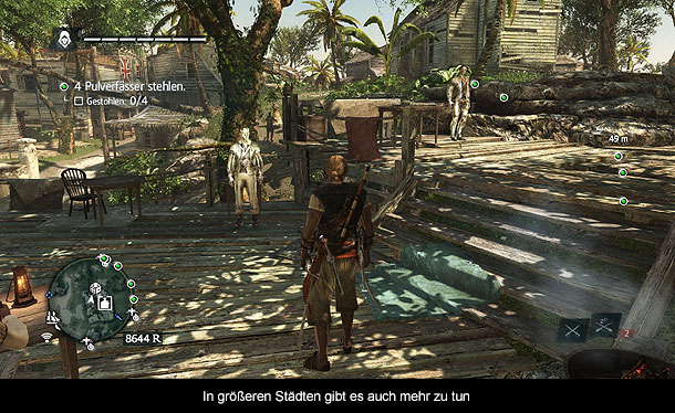 Wenn man sich nicht gerade auf dem Schiff befindet, ist man in Assassin`s Creed IV: Black Flag höchstwahrscheinlich an Land und darf die Städte und Dörfer zu Fuß unsicher machen. Hier gibt es dann unheimlich viele Dinge zu entdecken und zu erledigen. Einerseits gibt es natürlich die Storymissionen, welche die Geschichte vorantreiben. Leider fallen diese nicht besonders toll aus und laufen fast alle nach dem selben Schema ab. Erst wird die Zielperson verfolgt und belauscht, um sie dann am Ende zu eliminieren und das wiederholt sich dann einige male. Eher selten wird man auch mal auf Erkdungstour geschickt oder muss Sachen stehlen. Deutlich besser sieht es da bei den anderen Aktivitäten aus. Hier kann man unter anderem weitere Assassinen-Missionen annehmen, Piraten anheuern, seine Waffen und das Schiff verbessern, Schätze suchen, Collectibles sammeln, Inseln entdecken, Tauchen gehen, Tiere jagen oder eben auf den Weltmeeren alles entern, was bei drei nicht hinter dem Horizont verschwunden ist. Wer also nicht unbedingt Lust auf eine Storymission hat, wird sicher einen anderen Zeitvertreib in der Karibik finden und manche verlieren sich auch völlig darin. Leider haben all diese Spielbestandteile mit einigen Problemen im elementaren Gameplay zu kämpfen. So hat sich der bekannte Free Running Modus seit dem ersten Spiel kaum verändert und hat demnach auch heute noch mit einer etwas hakeligen Steuerung zu kämpfen, die oftmals anders reagiert, als man sich das vorstellt. In Verfolgungsjagden kann das schon mal zum Abbruch der Mission führen, weil man z.B. plötzlich ganz anders abbiegt. Ebenfalls verbesserungswürdig ist das Kampfsystem. Dieses basiert auf der Möglichkeit gegnerische Angriffe kontern zu können. Dazu muss eine Taste gedrückt werden und anschließend kann der Gegner mit einer einzigen weiteren Taste erledigt werden. Dadurch dass das Kontern kaum Geschick erfordert, werden Kämpfe eher zur belanglosen Last, als zu einem fordernden Spielerlebnis. Ebenfalls etwas nervig ist die Kollisionsabfrage, welche schon mal dafür sorgt, dass kein Angriff möglich ist, weil die Gegner nicht richtig erkennt werden oder etwas anderes den Angriff oder einen Konter verhindert. Wirklich schlimm ist jedoch die Gegner-KI ausgefallen, welche sich mit einfachsten Tricks aushebeln lässt. Denn selbst wenn man mal gesehen wird, kann man sich durch einfaches Verstecken in einem Busch vor der Nase des Gegners wieder unsichtbar machen. Dadurch werden die vermeintlich schweren Schleichmissionen ziemlich einfach, da die KI total unnatürlich agiert. Natürlich funktionieren diese Gameplayelemente zwar grundlegend, aber eben nicht besonders gut. Viel zu oft muss man sich über Kleinigkeiten ärgern, wodurch Missionen neugestartetn werden müssen. Vor allem zeigen andere Spiele, dass die Mechaniken auch besser gelöst werden könnten. Trotzdem entschädigt die schier unendliche Menge an Aktivitäten für die kleineren Fehler im Gameplay, da es einfach immer was zu entdecken gibt und man so im Grunde ständig mit "Erfolgsmomenten" belohnt werden kann, wenn man sich darauf einlässt. Daher stattet man der Welt gerne einen weiteren Besuch ab.