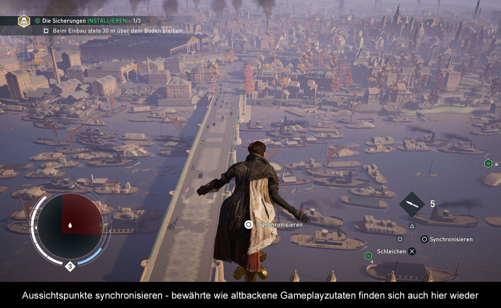 Angesiedelt ist der neueste Teil im London zur industriellen Revolution. Das bedeutet, Slums, Fabriken, reger Betrieb an der Themse, aber auch bereits noblere Regierungsviertel und Wohngegenden rund um Westminster. Der Look wurde jedenfalls sehr gut eingefangen und dank Wettereffekten und einem dynamischen Tag/Nacht-Wechsel (gab es im Vorgänger nicht) kommt viel Stimmung auf. Auch bei den Inneneinrichtungen (davon gibt’s schon eine ganze Menge) haben sich die Designer viel Mühe gegeben. So sehen Pubs in den Armenvierteln deutlich anders aus, als in den reicheren Bezirken. Die Ladezeiten halten sich in Grenzen und fallen nur dann wirklich negativ auf, wenn man eine Mission erneut laden muss. Ansonsten wirkt das visuelle Erlebnis wie aus einem Guss und weiß mit detaillierten Charaktermodellen und einzigartigen Finishern bei Zweikämpfen zu begeistern. Das die Framerate dann auch mal einen Sprung nach unten macht, stört zwar, ist jedoch jetzt nicht so auffällig, dass es das Spielerlebnis direkt beeinflussen würde. Der Ambientsound unterstreicht zudem passend die Atmosphäre, genauso wie die gefällige Musik, die öfters mal einsetzt. Großes Lob verdient auch die Abmischung (toller Surround-Sound) und die deutsche Synchronisation, die mit tollen Sprechern aufwartet und nur ein paar Patzer hinlegt (zu junge Stimme bei Darwin).