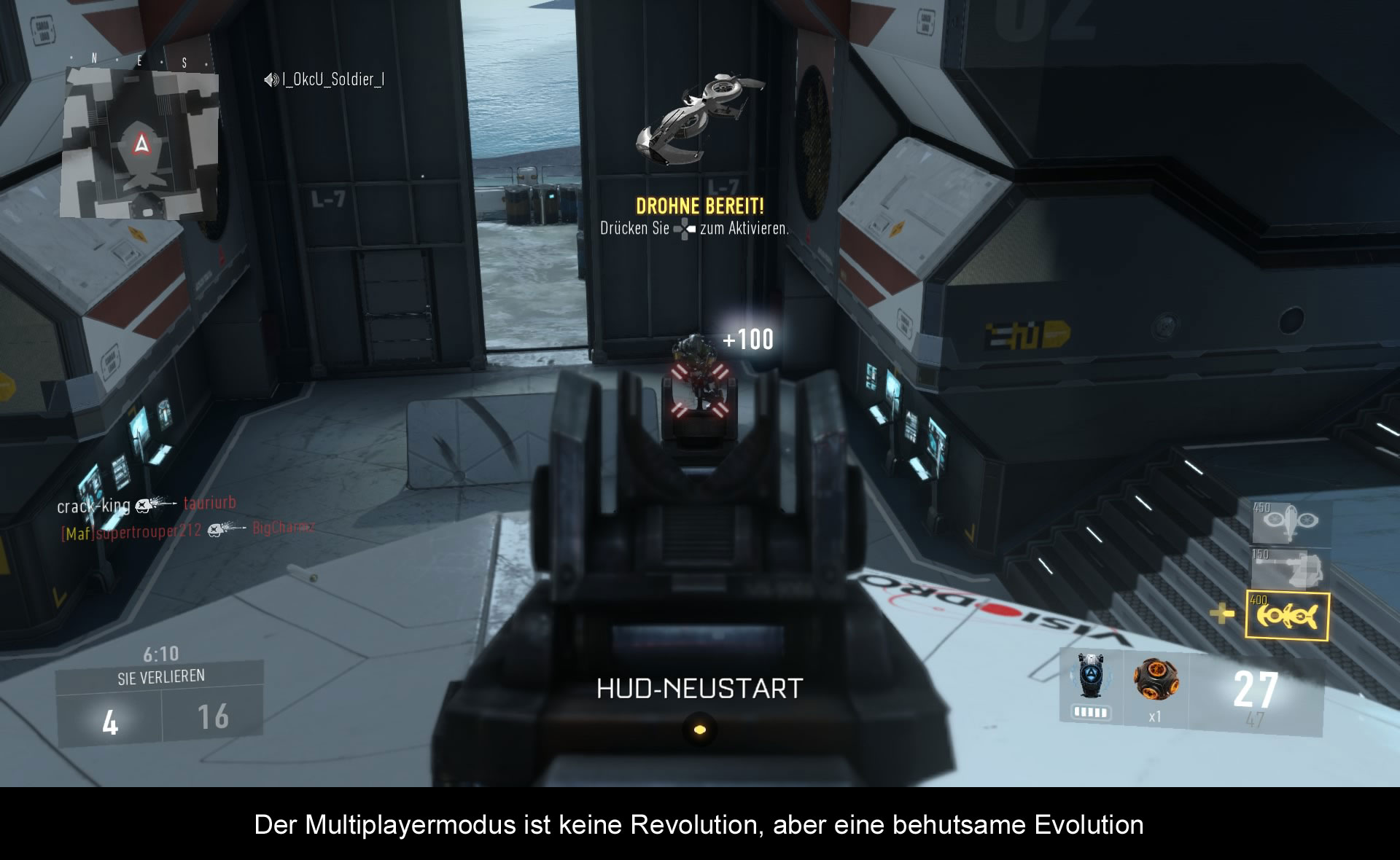 Seien wir mal ehrlich. Die meisten Spieler kaufen Call of Duty sicherlich nicht wegen der Kampagne. Hauptkaufgrund ist nämlich der Mehrspielermodus. Dieser ist natürlich auch in „Call of Duty: Advanced Warfare“ wieder mit dabei und bietet einiges. So gibt es nämlich eine Menge an Spielmodi von normalen Deathmatches über Capture the Flag bis zu Herrschaft, wo man diverse Zonen einnehmen und verteidigen muss. Für jeden ist hier etwas dabei und dank mehreren Playlists kann man auch wunderbar nacheinander unterschiedliche Modi spielen und das mit der gleichen Lobby. An sich jedoch kaum was Neues für Call of Duty Veteranen. Interessant wird es durch die Exoskelette, die online deutlich stärker auf die eigenen Wünsche angepasst werden können. Die Fähigkeiten, wie das Springen, ermöglichen völlig neue Spielweisen, die auch stärker in die Vertikale gehen und einfach nur verdammt viel Spaß machen. Man muss nämlich nicht nur aufpassen, dass niemand um die Ecke kommt, sondern dass auch niemand vom Dach springt und einen zu Boden schlägt. Glücklicherweise funktioniert das Matchmaking die meiste Zeit absolut problemlos und zu Lags kommt es auch eher selten. Die meiste Zeit hatten wir keinerlei Probleme beim Online-Spielen. Nur das Balancing der Waffen ist noch ausbaufähig. Denn fast alle Spieler laufen mit der BAL herum, da man mit ihr am besten und schnellsten zum Ziel kommt. Kein Genickbruch, aber durchaus etwas was Sledgehammer Games in Angriff nehmen sollte. Andere Waffen streuen nämlich einfach zu viel. Neben dem Mehrspielermodus gibt es auch noch einen Coop-Modus, in dem man mit Freunden möglichst viele Runden überleben muss. Keine Revolution, aber mit den richtigen Leuten ebenfalls unheimlich spaßig.