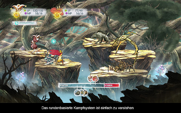 Auch wenn „Child of Light“ nicht danach aussieht, ist es im Kern ein ziemlich klassisches Rollenspiel. Denn sobald man im Spiel auf einen Gegner trifft, wechselt man in einen speziellen Kampfraum, in dem man gegen bis zu drei Gegner kämpft. Hier gilt es dann Zug für Zug die richtigen Entscheidungen zu treffen, um die Gegner zu besiegen. Zur Wahl stehen natürlich normale Angriffe, Zauber, aber auch diverse Items. Jedoch handelt es sich bei „Child of Light“ nicht um ein klassisches rundenbasiertes Kampfsystem. Denn statt das man nacheinander angreift, gibt es in „Child of Light“ eine Vorbereitungsleiste, die für alle Kämpfer gleich ist. Hier ist zu sehen, wie lange man selbst, aber auch die Gegner, für den nächsten Angriff noch brauchen und im letzten Teil der Leiste gibt es noch einen Vorbereitungsbereich. Dieser wird je nach Angriff schneller oder langsamer gefüllt und ist ganz wichtig im Kampf. Denn wenn man einen Gegner angreift, der sich gerade in der Vorbereitung befindet, wird dieser auf der Leiste zurückgeworfen und muss einen neuen Angriff starten. Wer dies geschickt nutzt, kann den Gegner kaum Luft zum Atmen lassen. Dies gilt leider aber auch für die Gegner und sorgt somit manchmal für brenzlige Situationen. Glücklicherweise muss man aber nicht alleine mit Aurora in den Kampf ziehen, sondern hat immer eine Gruppe aus zwei Kämpfern zur Verfügung, die man sich selbst zusammenstellen kann. Denn im Spielverlauf schließen sich immer mehr Leute Aurora an und jeder Charakter hat seine eigenen Stärken und Schwächen, die man gekonnt nutzen muss. Des Weiteren kann man die Attribute und Skills der Charaktere immer wieder verbessern, denn pro Kampf erhält man Erfahrungspunkte, womit man Level aufsteigt und pro Level gibt es einen Fertigkeitspunkt, der in unterschiedliche Attribute investiert werden kann. Ansonsten präsentiert sich „Child of Light“ als ziemlich geradliniger Plattformer mit einigen kleineren Rätseln, die jedoch nicht der Rede wert sind. Leider sorgt dies auch für etwas wenig Abwechslung auf lange Sicht, da meist nur die Bosskämpfe wirklich herausfordernd sind.