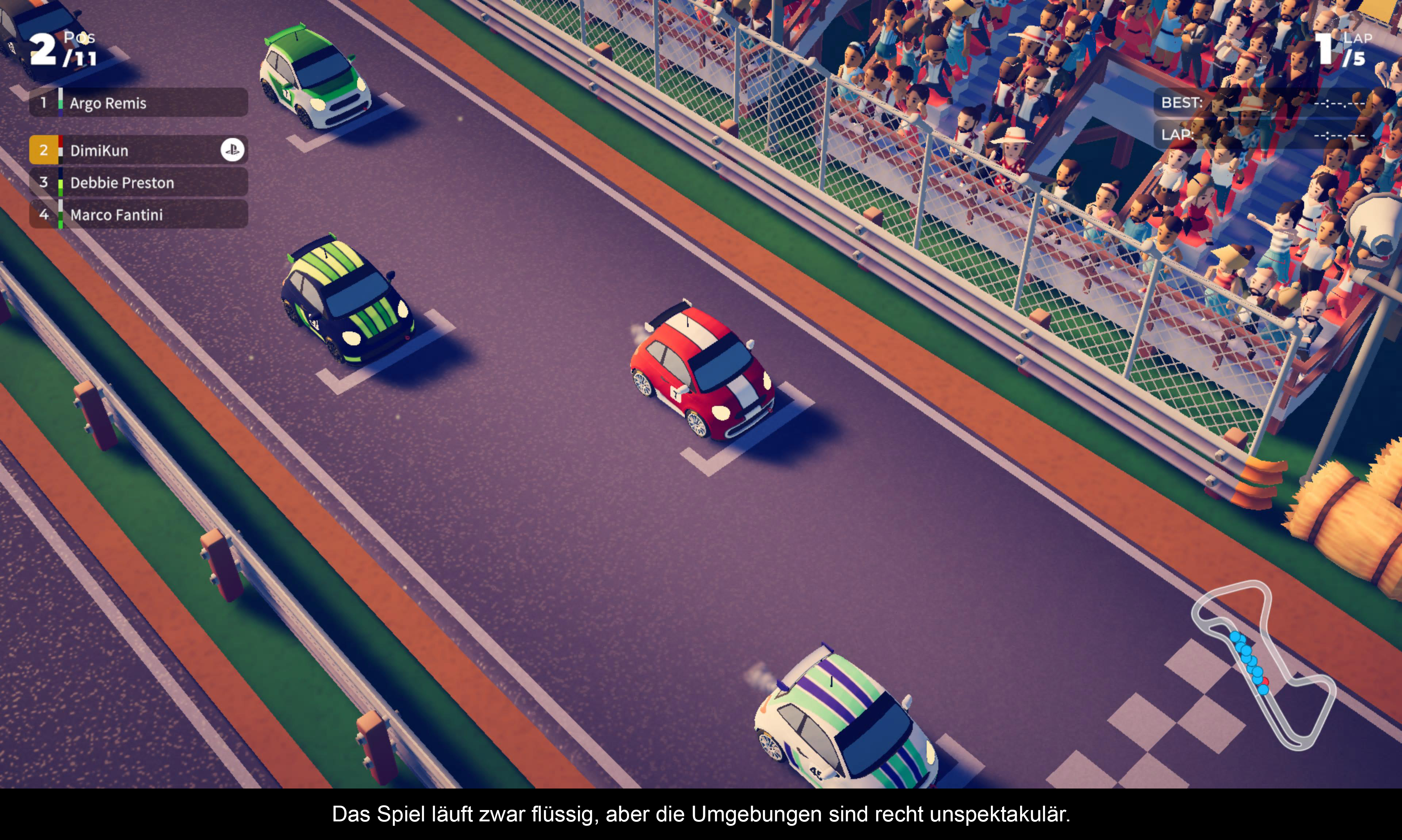 In Sachen Grafik wird auf Minimalismus gesetzt. Inspiriert von den Micro Machines Spielen der Vergangenheit bietet das Spiel eine Top-Down-Kameraperspektive von der man von oben herab auf die Autos guckt. Und während die Strecken zwar allesamt über verschiedene Layouts verfügen ist die grafische Gestaltung der Pisten recht simpel - bis hin zu ein wenig zu eintönig für meinen Geschmack. Ein paar mehr grafische Unterschiede – zum Beispiel Stadtrennen – und vielleicht auch mehr grafische Details hätten da sicher Abhilfe schaffen können. Immerhin wurden die Ladezeiten recht kurz gehalten, und auch die Framerate gibt sich zu keiner Zeit die Blöße. Was die Musik angeht, umfasst das Spiel einen recht interessanten Mix aus verschiedenen Elektro- und Retro-Sounds, die gut zum Geschehen passen, und zu keiner Zeit fehl am Platz wirken.