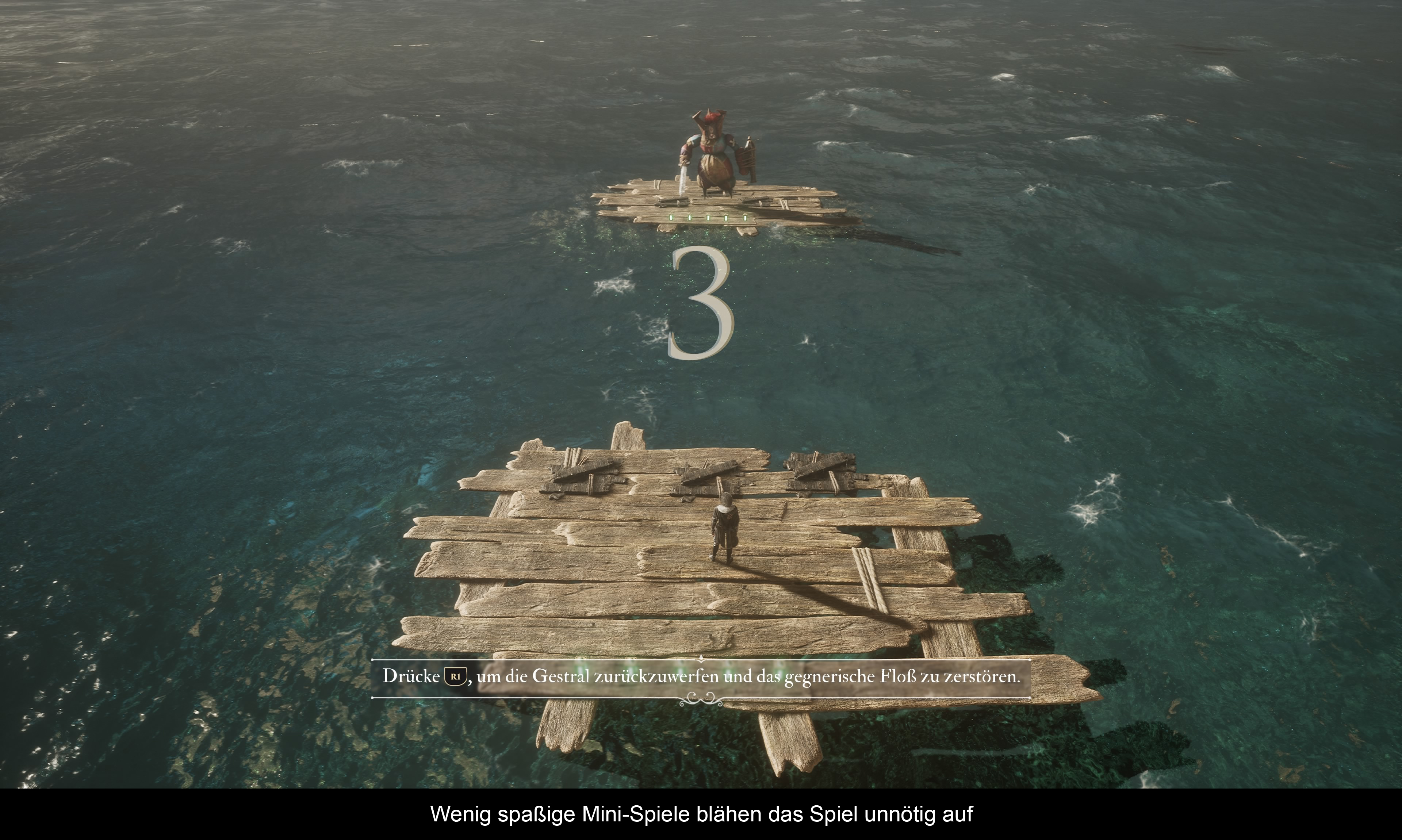 Allerdings gibt es auch einige Elemente, die man hätte weglassen können. Damit meine ich nicht die vielen Gespräche zwischen den Party-Mitgliedern im Camp, die tatsächlich zum Aufbau von Empathie beitragen (und kraftvolle Angriffe freischalten). Die Arena-Kämpfe sind ebenfalls noch akzeptabel. Doch bei den Mini-Spielen wie dem Gestral-Werfen auf dem Floß oder dem Hindernisparcours hört der Spaß auf. Diese sind weder unterhaltsam noch besonders gut umgesetzt. Hier hätten die Entwickler die Kapazitäten besser in ein umfangreiches Kompendium investieren können, denn es ist schwierig, den Überblick über die vielen Gegner und ihre Schwachstellen zu behalten.