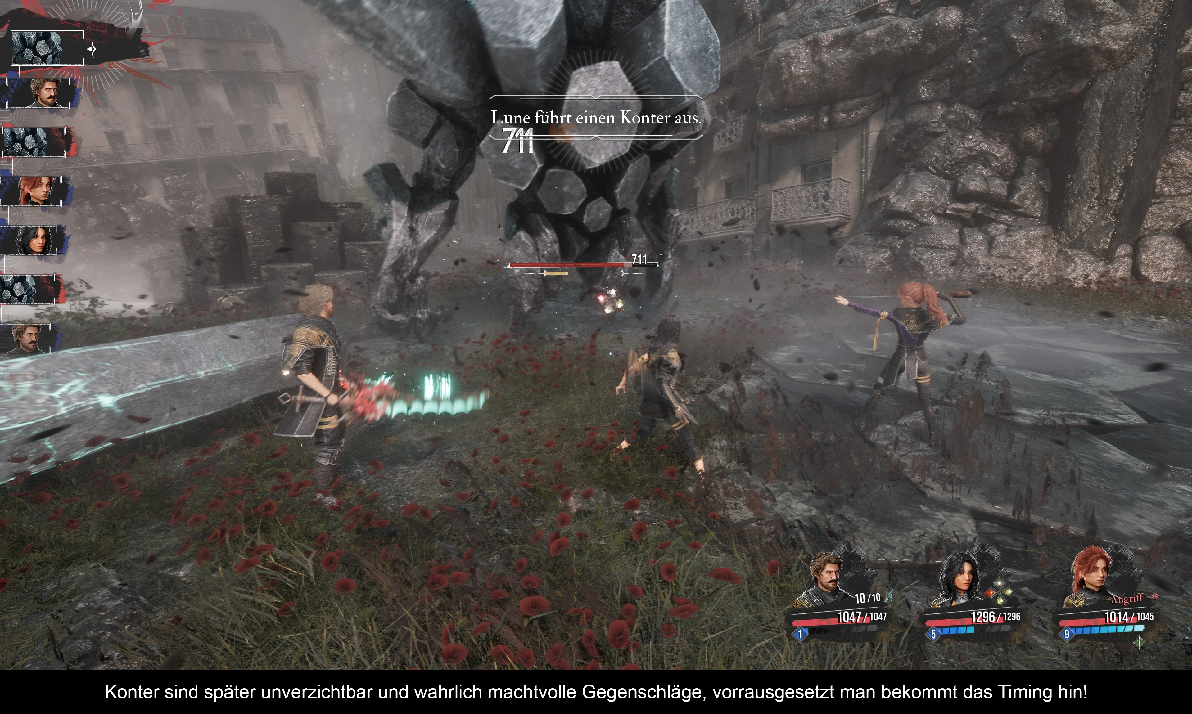Grundsätzlich basiert das System auf Rundenkämpfen, die durch „Freie Schüsse“ und Aktionspunkte ergänzt werden, welche für Spezialangriffe genutzt werden können. Zudem gibt es die bekannten Elementarkombinationen. Jeder Gegner besitzt spezifische Stärken und Schwächen, die man gezielt ausnutzen sollte. Besonders später im Spiel werden diese kombinierten Angriffe extrem wichtig, da die Kämpfe ab Kapitel 1 deutlich anspruchsvoller werden. Dann kommt es auch auf das richtige Timing an, denn nur wer gut im Ausweichen, Parieren und Springen ist, kann starken Schaden vermeiden bzw. kraftvolle Konter umsetzen. Das perfekte Timing muss man zu diesem Zeitpunkt verinnerlicht haben, da jeder Gegner über mehrere Attacken verfügt, die auch in verheerenden Kombos enden können. Bei manchen Monstern gelingt das nach ein oder zwei Versuchen recht gut – dann erkennt man den richtigen Zeitpunkt und passt den exakten Konter-Moment ab. Bei anderen Feinden ist es jedoch deutlich schwieriger. Hier hätte eine optische wahre Hilfestellung Wunder gewirkt. In den Barrierefreiheitsoptionen lassen sich nämlich nur die Quick-Time-Events bei Angriffen automatisieren, beim Verteidigen ist das leider nicht möglich. Zum Glück bietet das Spiel aber drei Schwierigkeitsgrade, zu denen man jederzeit wechseln kann. Bossgegner stellen noch einmal eine größere Herausforderung dar und kehren oft in stärkerer Form für eine zweite Runde zurück, was die Kämpfe besonders spannend macht. Die Auto-Save-Punkte sind großzügig gesetzt, was das erneute Angehen erleichtert.