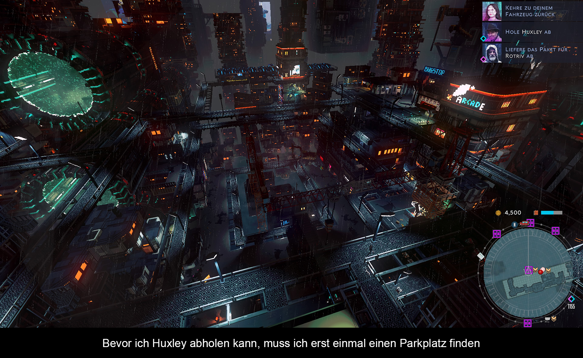 Im Grunde genommen sagt die Überschrift eigentlich schon alles über das Gameplay aus. Man schlüpft in die Rolle von Rania, die beim namensgebenden Lieferunternehmen Cloudpunk anfängt. Dort muss sie teilweise dubiose Päckchen abliefern und später sogar Personen transportieren. Dazu gibt es reichlich Hintergrundinformationen, die primär durch Gespräche vermittelt werden. Ja, gelabert wird in dem Spiel viel, man hat aber selbst fast keine Möglichkeiten, in den Gesprächsverlauf einzugreifen. Lediglich an manchen Stellen kann man die Zukunft der Ereignisse beeinflussen, in dem man zum Beispiel ein Paket nicht wie gewünscht abgibt oder einer Person auf die eine oder andere Weise hilft. Natürlich existiert auch eine übergreifende Geschichte, in die all die Aufträge mehr oder minder eingebettet sind. Am Ende musste ich mir aber eingestehen, weder die Charaktere noch die Story haben mich berührt. Das Gebotene ist nicht schlecht, aber auch nicht unfassbar gut umgesetzt. Aber es reicht aus, um noch einen Auftrag zu erledigen und dann noch einen – nur um zu erfahren, wie es wietergeht.