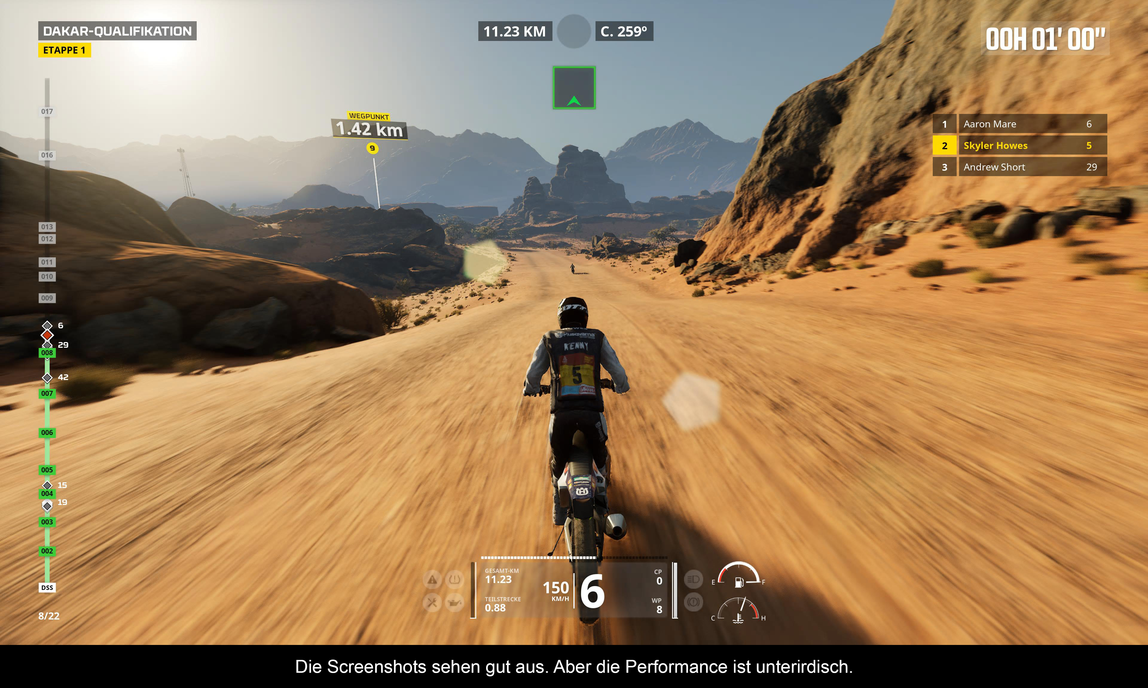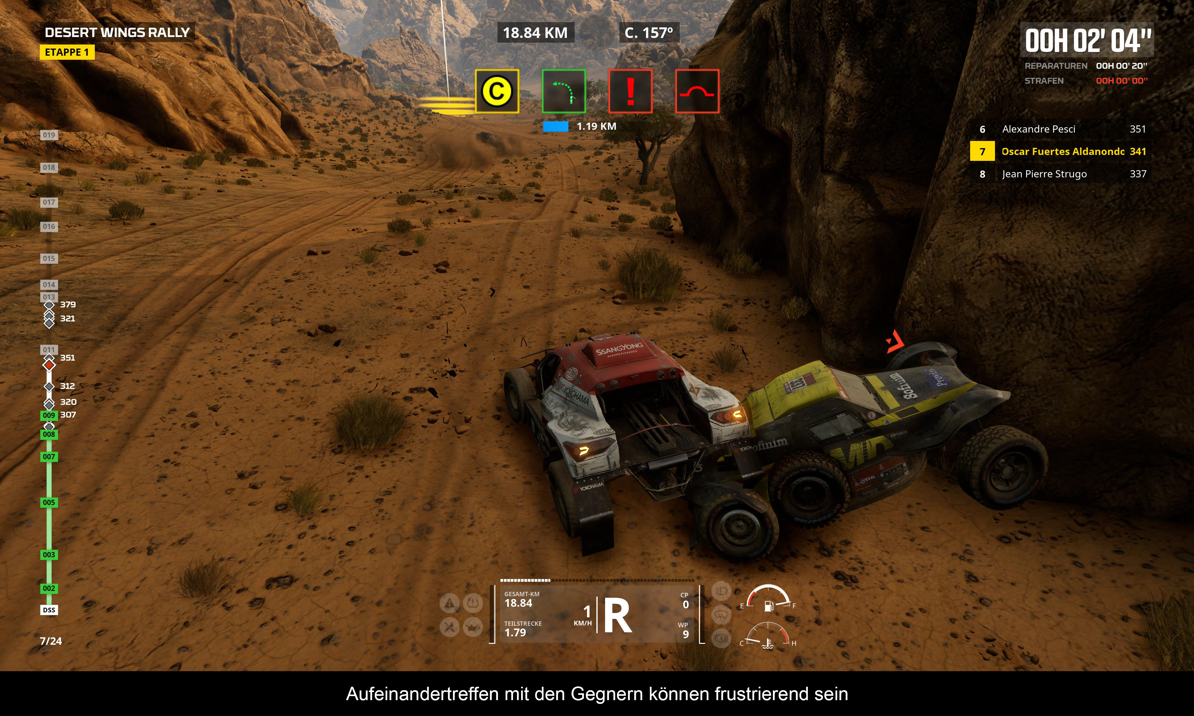 Und wo wir schon beim Thema Kurven sind. Ist Dakar Desert Rally eigentlich Simulation oder Arcade? Nun ja, die Antwort - wie so oft - ist irgendwo in der Mitte. Das Spiel verfügt nämlich über drei Schwierigkeitsgrade, die das Fahrverhalten enorm beeinflussen. Einsteigern empfehle ich an dieser Stelle, zunächst den Sport-Modus auszuprobieren, wo die Fahrzeuge ein wenig einfacher zu kontrollieren sind. Darüber hinaus wird einem auch bei der Orientierung enorm geholfen, da man hier zahlreiche Wegpunkte vorgesetzt bekommt, die man dann nachfahren muss. Werden Wegpunkte nicht eingenommen, bekommt ihr Zeitstrafen aufgesetzt. Weitere Zeitstrafen gibt es auch für Reparaturen, die vorgenommen werden müssen, wenn euer Fahrzeug zu viel Schaden genommen hat. Das Endergebnis des jeweiligen Wettbewerbs hängt dann von eurer Gesamtzeit ab. Noch kniffliger wird es hingegen im Pro-Modus, wo es keine Wegpunkte gibt und ihr die Strecke entweder der Karte entnehmen müsst oder sie von eurem Co-Piloten beschrieben bekommt. Und ab Level 25 gibt es sogar noch einen extremen Simulations-Modus, wo wirklich sämtliche Hilfen, inkl. Checkpoints oder Respawns entfernt und Kosten für Reparaturen immens erhöht werden. Für Casual-Gamer reicht der Sport-Modus jedoch absolut aus. da man sich auch hier zahlreichen Herausforderungen stellt. Denn neben der schwammigen Steuerung, die wie anfangs beschrieben ziemlich gewöhnungsbedürftig ist, hat man auch mit einer Vielzahl an aggressiven AI-Gegnern zu tun, die oftmals nichts besseres zu tun haben als wie der letzte Vollidiot in euch hinein zu rasen. Dies mag zwar extrem klingen, aber entspricht leider der Wahrheit. Selbst beim Start scheuen sich die Gegner nicht davor, euch einfach nieder zu mähen - selbst, wenn sich die AI dabei selbst aus dem Spiel nimmt und crasht. Es bleibt zu hoffen, dass dieses brutale Verhalten hoffentlich mit einigen Updates später noch korrigiert wird. Und leider gibt es neben Gameplay und AI noch einen weiteren Punkt, der euch vor große Herausforderungen stellen wird…