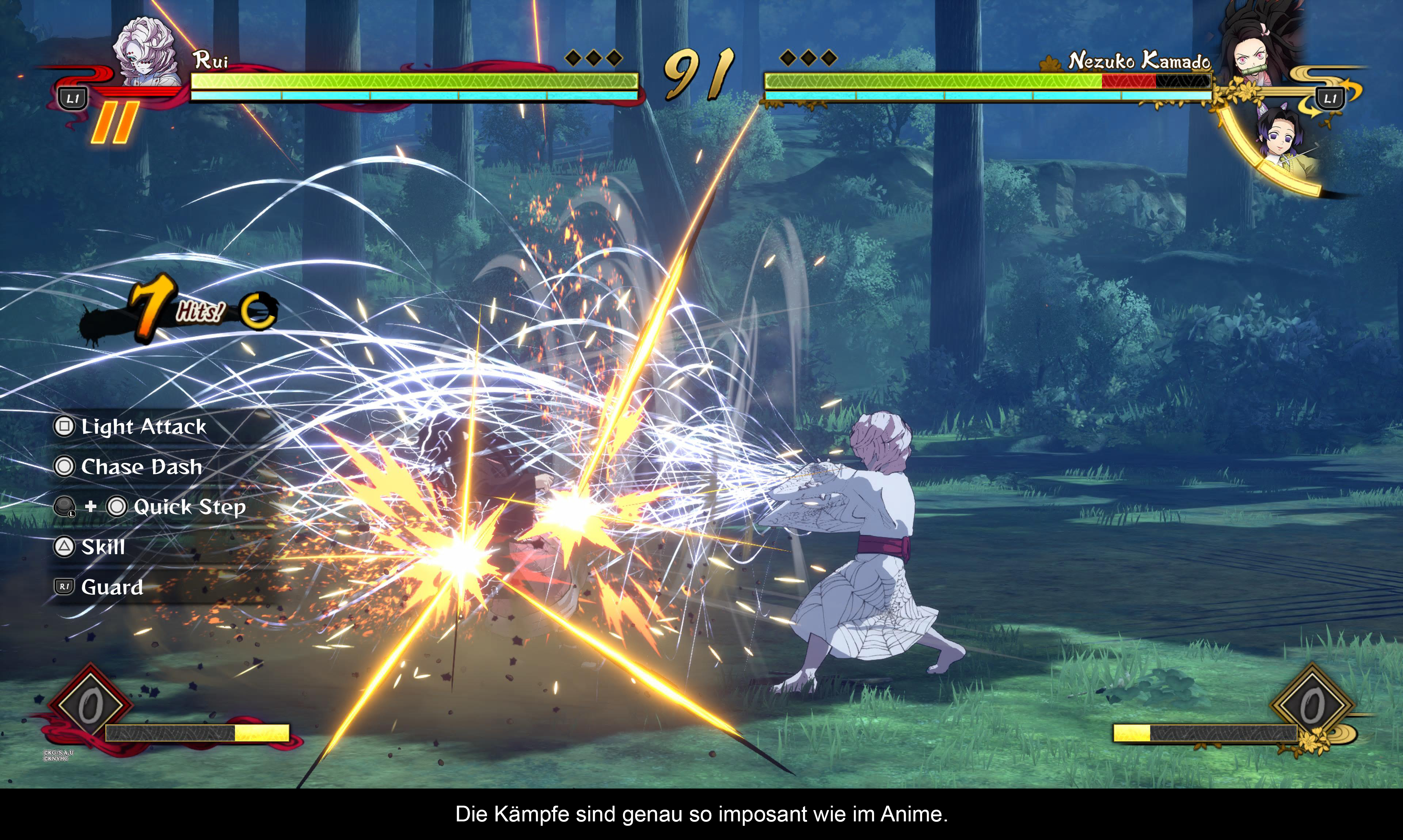Was das Gameplay angeht, geht es bei Demon Slayer ziemlich geradlinig zu. Wie eingangs erwähnt wechselt das Gameplay in abgeschlossene Kampfarenen, wo man dann mittels der Action-Buttons verschiedene Combos auf das Parkett zaubern kann. Gleichzeitig sollte man auch stets auf seine Ausdauer-Anzeige achten. Denn nur wer über die notwendige Energie verfügt, kann auch die Bildschirm-füllenden Combos aktivieren. Noch spannender wird es dann im weiteren Verlauf des Spiels, wo man nicht nur alleine gegen die Gegner kämpft, sondern gemeinsam mit einem KI-Partner, mit dem man sogar imposante Kombinations-Attacken durchführen kann. Was den Schwierigkeitsgrad angeht, kommt euch das Spiel eigentlich ganz gut entgegen. Wer anfangs aufgrund der vielen Moves noch etwas überfordert ist, erreicht nämlich auch mit Button-Smashing das Ziel. Wer sich aber ein wenig intensiver mit der Tasten-Auslegung beschäftigt und wirklich alle Mechanismen verinnerlicht, bekommt ein mitreißendes Gameplay spendiert, welches man auch im VS-Modus entweder offline oder online gegen den Computer oder echte Spieler an den Tag legen kann. Was die Kämpfe angeht, kann man übrigens aus 22 Charakteren wählen, die abgesehen von den Klonen allesamt über eigene Move-Listen verfügen. Dennoch muss man sagen, dass Fans solcher Anime-Spiele wie Dragonball oder auch Naruto keine Revolution erwarten sollen. Das Prinzip inkl. aller Combos und QTEs ist allgemein bekannt. Oberflächlich betrachtet kann man Demon Slayer eventuell auch noch ankreiden, dass das „Gameplay-Loop“ etwas zu simpel ist. Der Wechsel zwischen simplen Rumlaufen in der Oberwelt und dem Beginn eines Kampfes im Rahmen der Story ist manchmal etwas abrupt und holprig. Dies liegt aber vielleicht daran, dass sich die Entwickler enorm an der Struktur des Animes halten mussten. So hat man hier und da einige zusätzliche Kämpfe eingebaut, die es zwar so nicht in der Show gab, aber dem Spiel ein wenig mehr Fülle geben. Weitere Fülle bekam die Story unter anderem auch durch simple Fetch Quests, wo man innerhalb der Welt diverse Items einsammeln muss, die man dann im Hauptmenü gegen Belohnungen wie Fotos, Kostüme usw. eintauschen kann. Auch dies sorgt dafür, dass die Kampagne ein wenig künstlich aufgebauscht wirkt, aber eventuell waren den Entwicklern dabei schlicht und einfach die Hände gebunden. Klar sind die Rewards, die man mit der InGame-Currency freischalten kann ganz nett, aber großartig zur Langlebigkeit des Spiels tragen sie nicht bei. Hinzu kommt ein relativ leichter Schwierigkeitsgrad im Singleplayer-Modus, der ebenfalls dazu beiträgt, dass man viele Herausforderungen bereits mit dem ersten Versuch meistert. Alles in allem muss man aber anerkennen, dass inhaltlich nur das Mindestmaß an Modi geboten wird. Und man muss auch abwarten, ob sich das Spiel auch unter Multiplayer-Fans einen ähnlich großen Namen aufbauen kann, wie zum Beispiel die Naruto oder Dragonball-Titel von Namco Bandai.