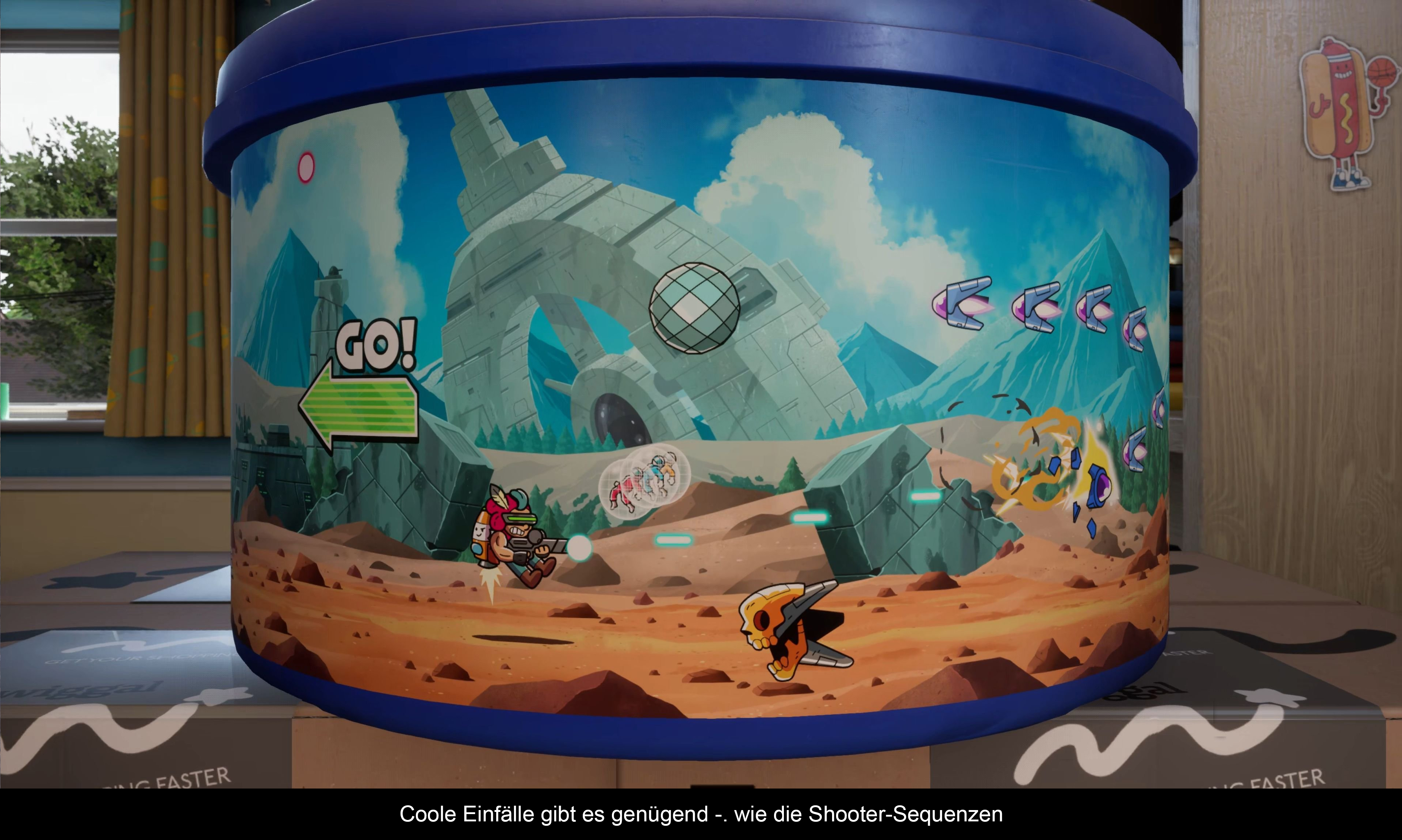 Man steuert Jot aus der Draufsicht, was auch logisch ist, da der Titel ja in einem Buch spielt. Es gibt einen Standartschwertangriff und später auch noch drei Spezial-Moves. Die Schadenswerte lassen sich durch gefundene Glühbirnen im Shop aufwerten. Eine Galerie kann man ebenfalls mit Kunstwerken füllen – sofern man sie aufspürt. Ab und an, kann es jedoch passieren, dass man Umdenken muss. Dann gibt es Geschicklichkeitseinlagen mit Krass die an ein Musikspiel erinnern, Viola beweist sich in Bubble Bobble Showdowns und Jot selbst verprügelt in Oldschool Manier die Schergen (inkl. Ausweichen und verschiedenen Schlagarten) oder ballert sich Retro-mäßig mit Laserknarre durch Sci-Fi Welten und rettet Wissenschaftler. Auch der Bosskampf gegen die Elfe war recht cool. Überhaupt warten immer mal wieder ein paar Bosse darauf, eins auf die Mütze zu bekommen. Doch nicht nur Gewalt ist gefragt, auch Kopfschmalz wird verlangt. Neben kleineren Schieberätseln und den coolen Meta-Puzzles, fand ich besonders die Wort-Rätsel gelungen. Hierbei nutzt man unterschiedliche Wörter, um die Spielwelt zu verändern. Doch das ist noch nicht alles! Es gibt ja noch die dritte Dimension und hier sieht man alles aus einer dreidimensionalen Perspektive. Die Steuerung unterscheidet sich dabei nicht, wohl aber die Umgebung. Über den Tisch und durch Spielzeugburgen rennt Jot, verdrischt Monster und feindliche Soldaten. An bestimmten Punkten muss auch Geschlichen werden, was jedoch recht selten vorkommt und daher auch nicht weiter nervt.