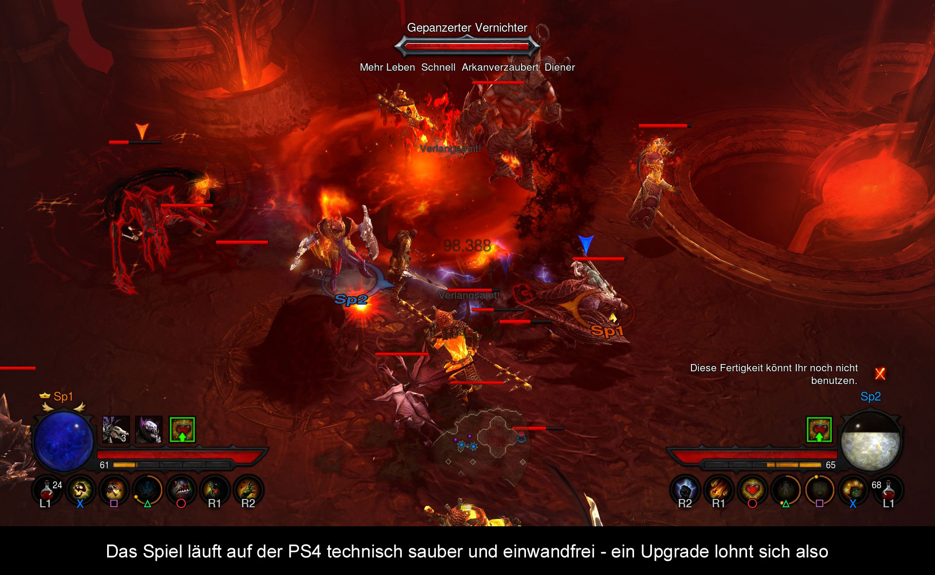 Im Gegensatz zu crack-king, habe ich den ersten Teil (damals auf dem PC) geliebt und ausgiebig gespielt. Der zweite Teil war dagegen nicht mehr so nach meinem Geschmack. Und Teil drei habe ich absichtlich auf der PS3 ausgelassen, als ich erfahren habe, dass Blizzard nicht mal eine HD-Auflösung hinbekommen hat. So genial sieht das Ganze nämlich nicht aus. Doch zurück zur PS4 Fassung. Diese läuft technisch einwandfrei in Full HD und mit stabilen 60 Bildern pro Sekunde. Über den Grafikstil lässt sich übrigens streiten. Mir sagt der Comicstil nicht ganz zu, da fehlt mir die düstere – teils horror-artige Atmosphäre des ersten Teils. Dafür setzt das Add-On „Reaper of Souls“ nahtlos an das Abenteuer an, wobei keines der beiden Enden auch nur ansatzweise befriedigt. Doch zurück zum Gameplay, das macht nach wie vor süchtig, vor allem, wenn man gleich einen Schwierigkeitsgrad höher spielt. Das Loot-System ist umfangreich und wird nach dem erstmaligen Durchspielen immer besser – Freunde können zwischenzeitlich helfen. Ob nun aktiv im Spiel oder passiv, via Item Geschenke. Auch spielen sich die vier Figuren unterschiedlich, so dass es Sinn macht, „Diablo 3“ mit anderen Klassen durch zu zocken. Was mir dagegen etwas fehlt, sind lange Dungeons und interessante Nebenauftrage (das machen andere Rollenspiele besser). Doch hier geht es ja primär um Action und die lässt nicht lange auf sich warten. Solo-Spieler können sich sogar KI Begleiter ins Boot holen, damit es nicht ganz so eintönig unterwegs wird. Ansonsten lockt das Spiel mit immer neuen Fertigkeiten, die dem Aufleveln den nötigen Pepp verleihen. Ergo, der Umfang stimmt, die Steuerung ist super und das Dämonenmetzeln macht vor allem Gaudi – ob alleine oder zu viert. Also: Worauf wartet ihr noch? Lasst uns Teufelsärsche kicken!