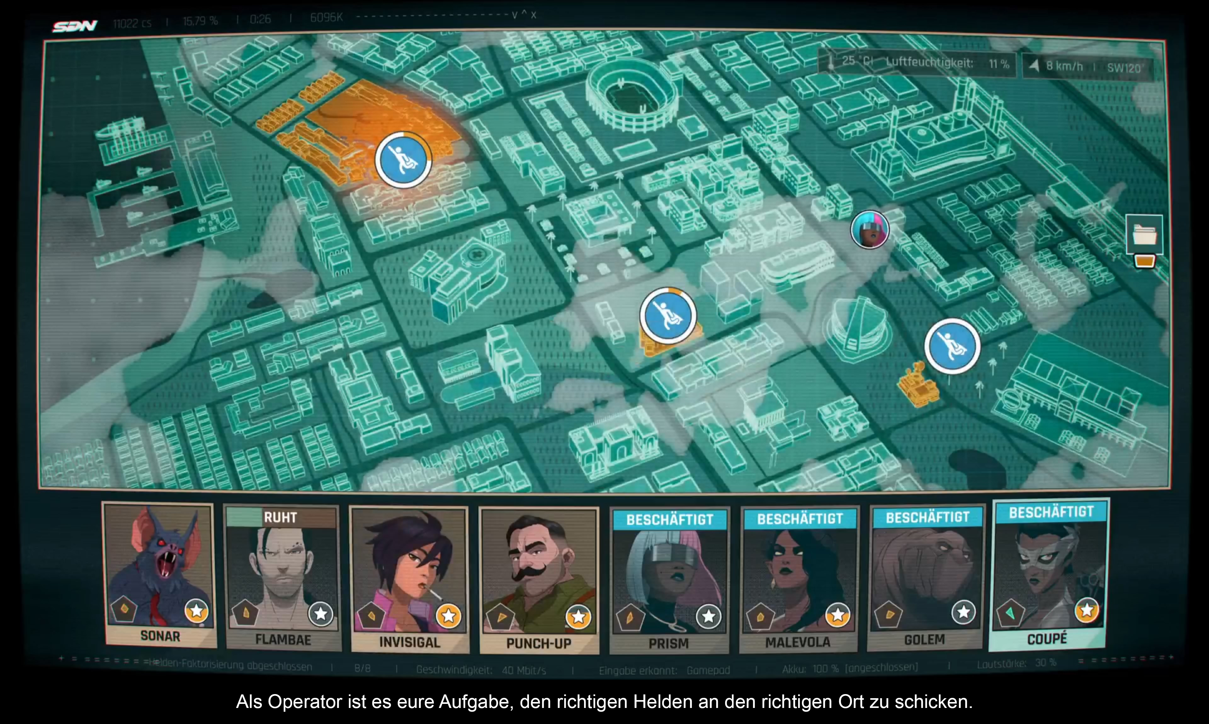 Was man vom Fall Telltale lernen konnte, ist, dass diese Art von Geschichten mehr Gameplaytiefe brauchen als reine Quick-Time-Events (QTE) oder das Auswählen von Dialogen. Der Kniff des Operators ist nicht nur erzählerisch schlau, sondern ermöglicht auch zusätzliches Gameplay. In seiner Tagesschicht als Operator für das SDN entsendet Robert sein Team auf Missionen. Je nach Charakter und Fähigkeiten können diese unterschiedlich erfolgreich sein. Die Aufgabe des Spielers ist es, den richtigen Helden zur richtigen Mission zu schicken.