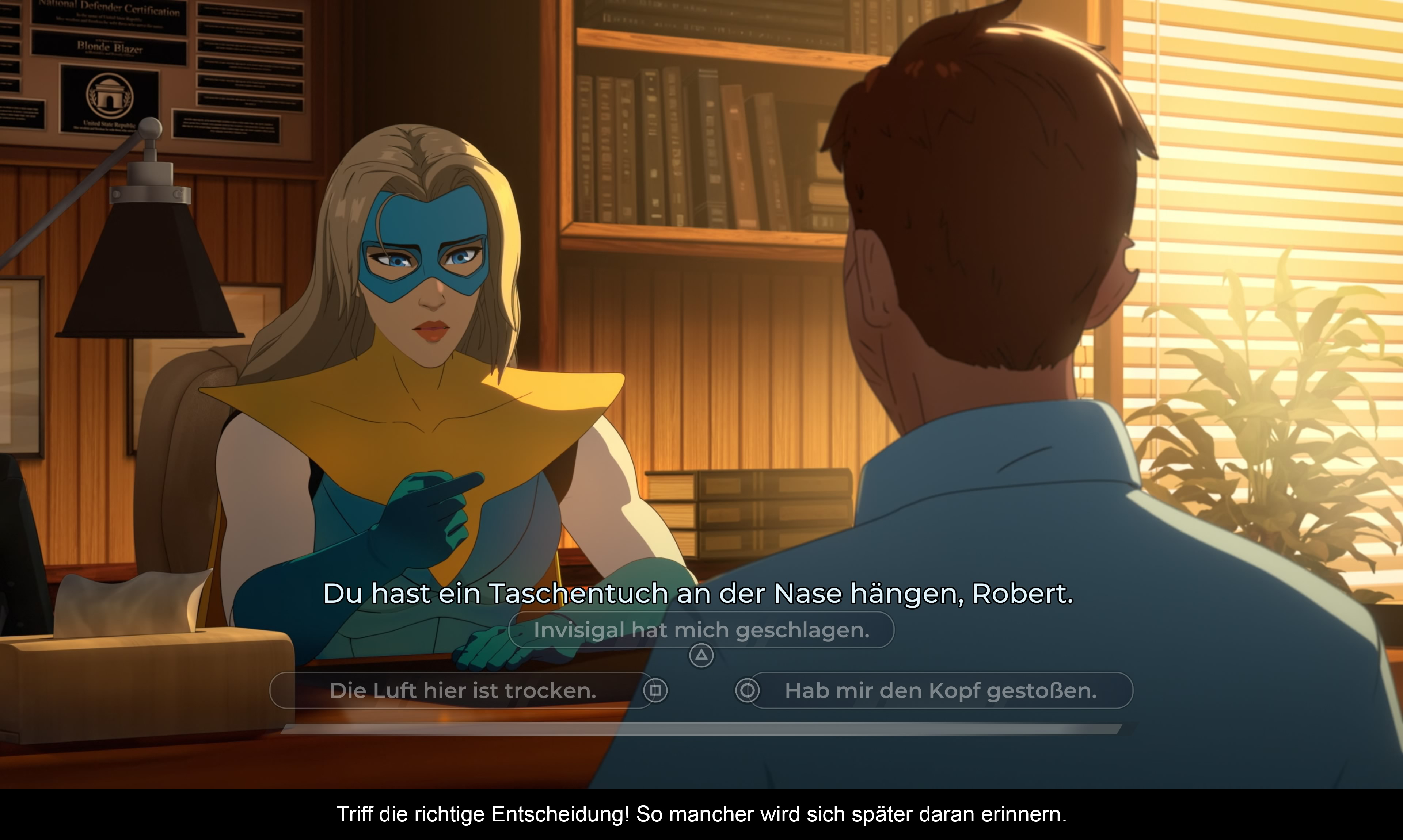 Acht Episoden lang verfolgt man die Geschichte des gefallenen Helden, wie er trotz aller Widrigkeiten nicht aufgeben kann und will, sowie einer Truppe von Schurken, die vielleicht wirklich nur einmal eine dumme Entscheidung getroffen haben. Die Dialoge sind natürlich geschrieben und wirken keinesfalls aufgesetzt. Das macht die ganze Handlung wie auch die Charaktere sehr nahbar. Ein Großteil der Schurken und Helden bekommt in der Geschichte Zeit zugesprochen, damit man mehr über ihren Charakter erfährt. Jedoch dreht sich die Haupthandlung primär um Robert, Invisigal und Blond Blazer. Dies sind auch die zwei „Hauptrouten“, denen man folgen kann.