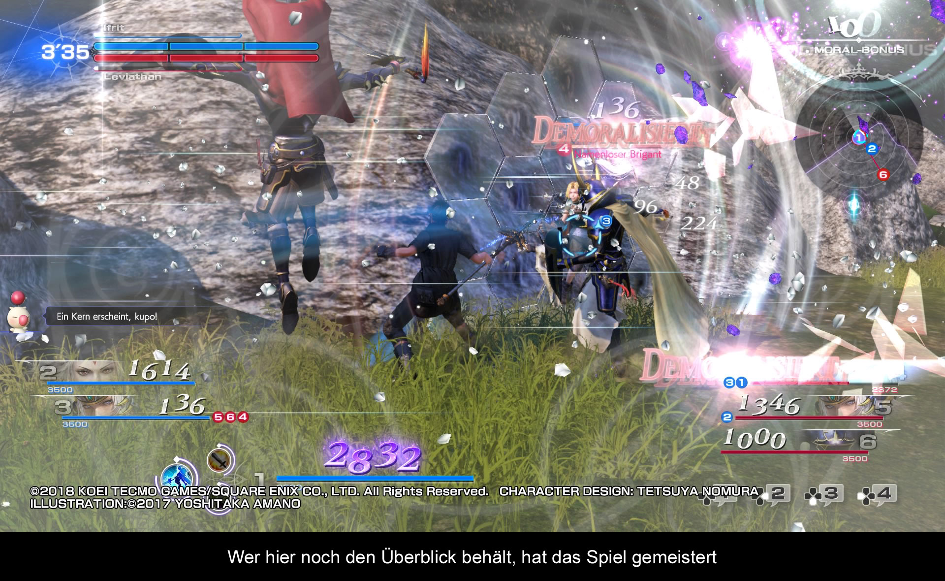 Im eigentlichen Kampfgeschehen wird einem klar, dass man sich vom Vorgängern weit entfernt hat. Vorbei sind die Zeiten von Einzelkämpfen, nun wird zu dritt gegen drei Gegner in einer großen Arena gekämpft. Doch starten wir bei den Gemeinsamkeiten. Noch immer steht eine Vielzahl von Helden und Schurken zur Auswahl. Ob Zidane, Jecht, Sephiroth oder der Krieger des Lichts, die bekanntesten Figuren sind zurück. Dazu kommen neue Charaktere aus Final Fantasy XIV, XV, Tactics und Type-0. Leider wurden einige der neuen Charaktere aus Dissidia 012 gestrichen, doch geplanter DLC soll dieses Problem beheben. Alle diese Figuren wurden nun verschiedene Rollen zugeteilt, welche ihre besonderen Fähigkeiten beschränken und sie jeweils gegen eine andere Klasse verwundbar oder übermächtig machen. Leider kommuniziert das Spiel nicht, welche Rollen dies sind und welche Vorteile es dem Spieler bringt. Generell ist man mit Erklärungen sehr zurückhaltend und es wird dem Spieler überlassen es zu erahnen und zu erlernen. Aber nicht nur bei den Klassen hat man es als Neuling sehr schwer, auch beim eigentlichen Kampfsystem. Veteranen werden das Bravery System aus den Vorgängern kennen und sich gleich heimisch fühlen. Im Gegensatz zu vielen anderen Kampfspielen attackiert man in Dissidia die Lebenspunkte des Gegners nicht direkt. Im Kampf gilt es vor allem Bravery Punkte aufzubauen, was durch eine eigene Attacke ermöglicht wird. Sind diese Punkte höher als beim Feind, kann man mit seinem Lebenspunkteangriff zuschlagen. Der Unterschied zwischen den Punkten wird dem Widersacher dann von seinen Lebenspunkten abgezogen. Nach dem erfolgreichen Angriff verliert man ebenfalls die aufgebauten Punkte und wird für die Gegner zu einen schnellen Ziel. Klingt sehr verwirrend, doch nach ein paar Kämpfen versteht man das System. Neben direkten Attacken gibt es noch drei Ex-Angriffe. Zwei ermöglichen es einem seine Mitstreiter zu unterstützen oder für seine Gegner eine Falle zu legen. Dadurch kann man aktiv Angriff, Verteidigung und Bravery manipulieren und fördert das Gruppenbilden. Die dritte Ex-Attacke ist eine Spezial-Attacke der Figur. Alle drei Attacken haben einen Cool-Down und können nicht unbegrenzt eingesetzt werden. Zuletzt gibt es noch die mächtigen Esper. Im Kampf erscheinen immer wieder Kristalle, welche zerstört werden wollen. So füllt man über den Kampf hinweg die Esper-Leiste und beschwört einen der Sieben. Diese mächtigen Esper erscheinen direkt auf dem Kampffeld und hindern den Gegner bestimmte Manöver auszuführen und erhöhen vor und nach der Beschwörung verschiedene Fähigkeiten der Helden. Glücklicherweise sind diese keine übermächtigen Figuren, denn bei der Beschwörung ist man verwundbar!