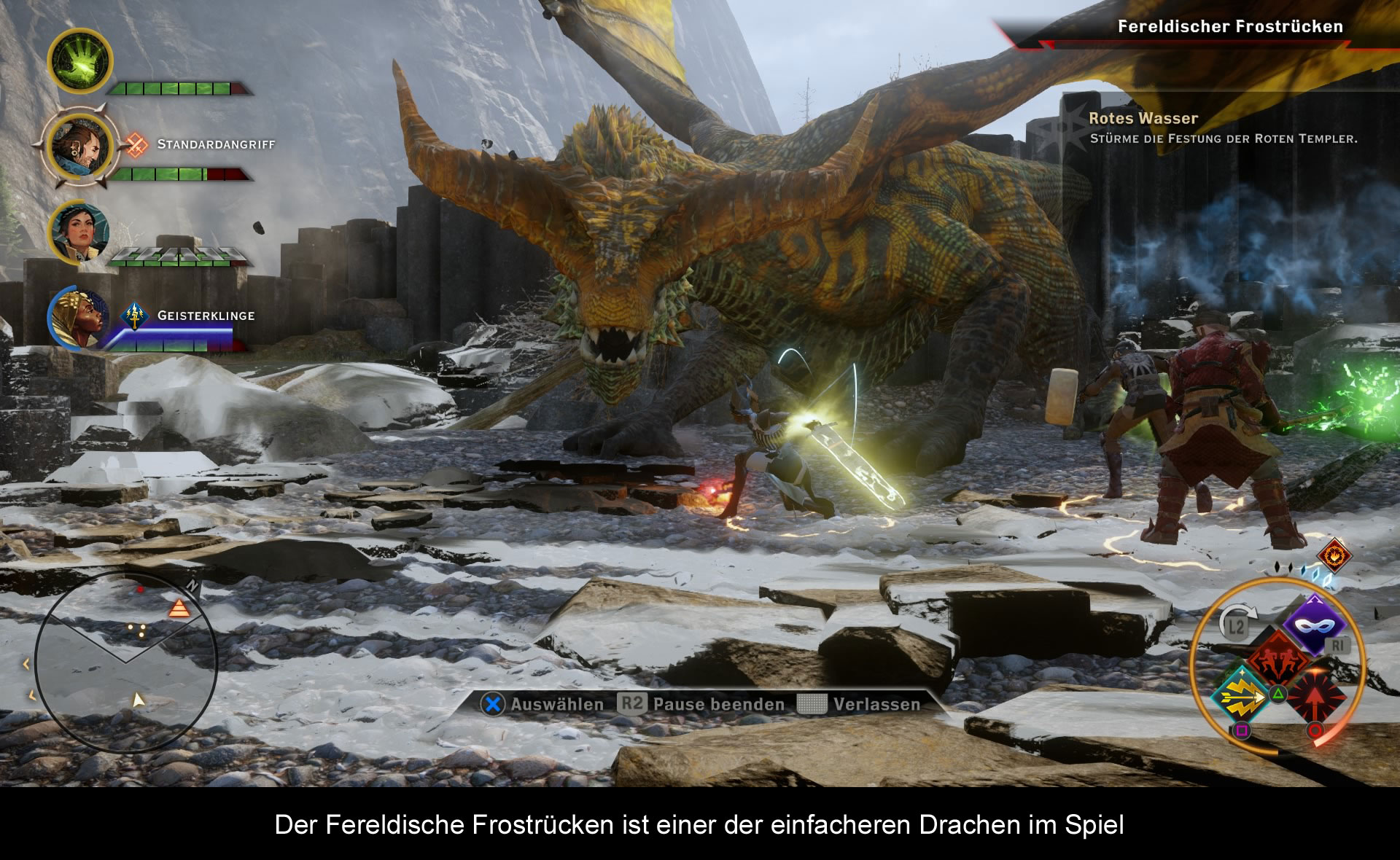Beim Erkunden der Lande wird man meist auf kleinere Gegnertruppen stoßen, welche keine großen Herausforderungen darstellen. Mit Hilfe der CPU-Mitstreiter wirft man einfach den besten Angriff gegen die Schurken, was zu einem schnellen Sieg führen sollte. Bei einem richtigen Gegner ist mehr Taktik gefragt. Es gilt herauszufinden, gegen welche Zauber er besonders anfällig oder gegen welche Angriffe er immun ist. Danach kann man nach Belieben durch die Gruppe wechseln und mit dem Kämpfer den jeweiligen Angriff ausführen oder bestimmte taktische Befehle geben. Das alles wird in Echtzeit ausgeführt, deshalb sollte man stets die Anzeige der Angriffe im Auge behalten. Diese benötigen eine gewisse Zeit, um aufgeladen zu werden. Auch spielt das Gelände eine Rolle. Bogenschützen auf einer Erhöhung haben stets einen Bonusvorteil. Zur Unterstützung kann man auf bestimmte Flächen einen Zauber aussprechen, welche Mitstreiter heilt oder Gegner verwundet. Erfahrene Schurken hingegen legen Fallen. Da es in der Welt von „Dragon Age: Inquisition“ an Heilzaubern fehlt, sollte man auch immer genügend Tränke bei sich haben. Geht man dennoch zu Boden, reicht es wenn man einen Mitstreiter zum Gefallenen hin bugsiert und ihn mit einem Tastendruck wiederbelebt. Wem das zu hektisch ist, kann zur taktischen Ansicht wechseln und es wie ein klassisches rundenbasiertes Rollenspiel spielen. Leider hat man bei Bioware vergessen, wie so etwas funktioniert und diese Funktion ist kaum brauchbar. Die überladene Steuerung und seltsame Kamera lassen einen schnell wieder in das hektische Treiben zurückflüchten.