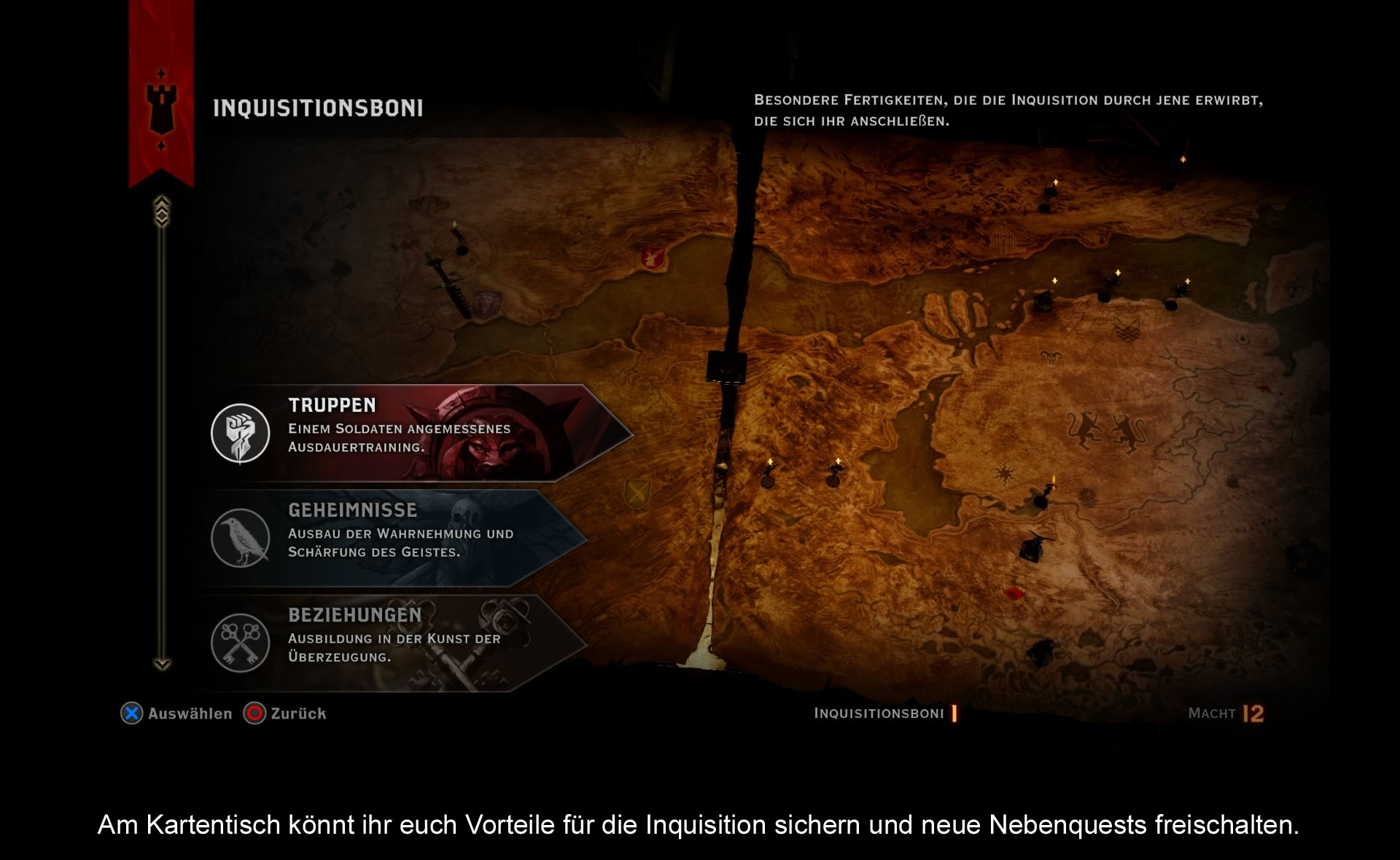 Neben Erfahrungspunkten steigt nach bestrittenen Aufgaben auch der Einfluss der Inquisition und man bekommt Machtpunkte gutgeschrieben. Diese Machtpunkte kann man im Hauptquartier auf einer Landkarte einlösen. Hier stehen euch drei Berater zur Seite: Cullen für das Militär, Josephine für die Diplomatie und Leliana für die Spionage. Diese haben für euch Auftrage parat und weisen auf wichtige Ziele auf der Weltkarte hin. Mit den errungenen Machtpunkten kann man seine Berater befehlen, die verschiedenen Aufgaben auf ihre Art zu lösen. Dadurch bekommt man mehr Einfluss, entdeckt neue Regionen oder unterstützt das eigene Reich z.B. mit Wachtürmen. Ein interessantes Konzept, was einen nicht linearen Spielverlauf ermöglicht. Auf diese Art und Weise kann man nämlich selbst beeinflussen, welches Ziel man als Nächstes erreichen will. Das ganze System hat nur einen Haken, das Zeitfenster. Wie bei Free 2 Play Spielen muss man warten, bis ein bestimmter Zeitraum verstrichen ist. Danach stehen die Berater erst wieder zu Verfügung. Da man hier jedoch ein Vollpreisspiel vor sich hat, wirkt die Einbindung der Zeitcounter fehl am Platz. Das hätte man besser lösen können.