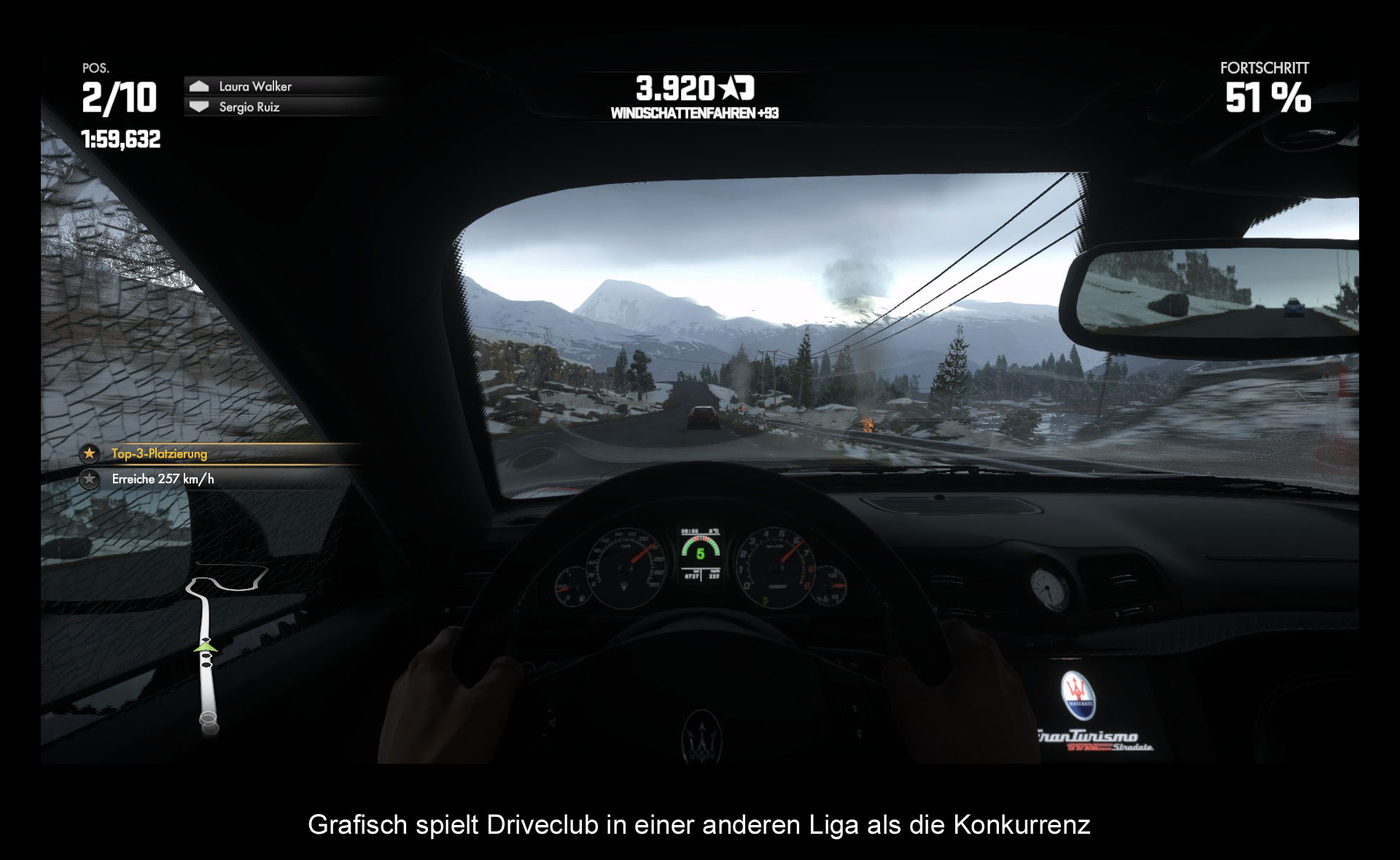 ...ich das Auto am Sound erkenne und das im Spiel? Denn neben dem Handling und noch vor der Grafik ist der Sound im Spiel klar der Star. Was die Evolution Studios hier abliefern, ist einfach nur noch atemberaubend und die harte Arbeit hat sich gelohnt. Jedes Fahrzeug klingt nämlich anders und vor allem real. Mit der entsprechenden Soundanlage kann man den Motor fast schon spüren und spätestens bei den schnelleren Fahrzeugen von Pagani, RUF oder Ferrari wird man sich über das Motorknurren jedes Mal freuen. Es ist wirklich erstaunlich wie authentisch die Sounds rüberkommen. Egal ob man sich im Cockpit befindet oder außerhalb. Aber nicht nur die Motoren klingen toll, sondern auch Unfälle, Reifenquietschen oder einfach das simple Fahren über dem Schnee. Da dürften sich gerne andere Entwicklerstudios eine Scheibe von abschneiden. Einzig der Soundtrack selbst passt nicht so ganz ins Bild des Rests. Denn der hat im Grunde nur den schon bekannten Song „How fast do you wanna go?“ mit Ohrwurmcharakter. Alle anderen verlieren sich in belanglosen Technobeats und sind nicht der Rede wert. Das ist wohl auch der Grund warum man den Soundtrack nur im Menü und nicht in den Rennen zu hören bekommt. Dort muss man diesen nämlich erst eigenhändig einstellen.