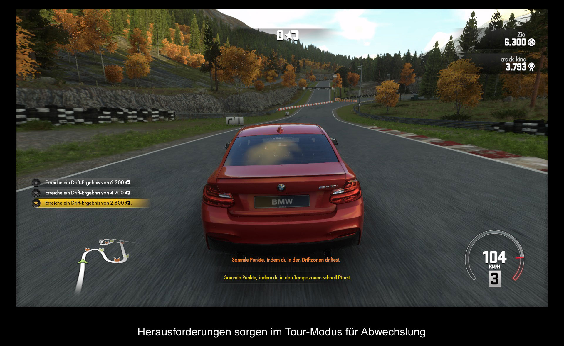 Kernstück der Einzelspielererfahrung ist der Tour-Modus. Hier erhält man eine Reihe an Events, welche mit den langsameren Fahrzeugen beginnen und euch pro Event bis zu drei Sterne erlangen lassen. Einen Stern gibt es immer für besondere Leistungen in einem Rennen, wie unter die ersten drei zu kommen, eine Rundenzeit zu schlagen oder aber ein Duell auf der Straße für sich zu entscheiden. Je mehr Sterne man erreicht, desto mehr Events werden freigeschaltet und die Fahrzeuge werden dann auch immer schneller. Dabei ist es nicht wirklich schwer alle Events freizuschalten, da die meisten Sterne relativ leicht zu erlangen sind. Wer aber wirklich alle Sterne bekommen möchte, darf sich auf einiges gefasst machen. Denn einige Rundenzeiten oder Driftpunktzahlen haben es in sich und benötigen einiges an Übung von euch. Natürlich kann man aber auch abseits der Tour einzelne Rennen veranstalten, die man nach seinen eigenen Vorlieben anpassen kann. Von der Rundenzahl, über die Anzahl der Gegner bis hin zur Tageszeit kann man nahezu alles seinen Vorlieben nach einrichten.