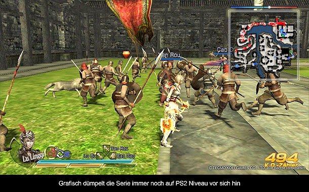 Mit jedem neuen Dynasty Warriors Teil wird das Gameplay verbessert. Immer mehr feine Nuancen fließen ein, nur die Grafik wirkt immer noch wie von Gestern. Auf den ersten Blick scheinen Schlachtfelder leer und detailarm, auch gleicht ein Soldat dem anderen. Während man sich durch weite Ebenen und Klonsoldaten kämpft, wächst in der Ecke der KO Zähler. Mit der Zeit fragt man sich, wie konnte plötzlich eine KO Zahl von über 1000 in der Ecke stehen? Quantität übertrifft in diesem Fall die Qualität. Mit Leichtigkeit lässt der Computer Gegnermassen von weit mehr als 100 Soldaten aufmarschieren und selbst nach dem letzten erledigten Soldaten gibt es nochmal 100. Wer hat hier noch Zeit auf matschige Bodentexturen und ewig gleiche Korridore zu achten. Sollte man doch einmal die Zeit finden und die Blicke schweifen ab, erkennt man fein modellierte Offiziere welche mit Details strotzen. Führt man sich dann noch vor Augen, dass es selten bis nie zu Framerate Einbrüchen kommt, darf man hier den Entwicklern doch ein bisschen Lob zukommen lassen. Man hat nur mit geringsten Abstrichen die PS3 Version auf die PS Vita gebracht. Kritiker werden zwar sagen, dass die PS3 Version auch schon kein Grafik-Highlight war, aber dass die PS Vita selbiges ohne Probleme schafft ist doch sehr beeindruckend. Auch die Animationen haben es in sich. Jede Waffe, jeder Musou Angriff ist ein Unikat und unterscheidet sich nicht nur spielerisch. Aufwendige Waffen wie der Belagerungspeer verfügen auch über ihre eigene Animation. Viel Liebe zum Detail wurde darin versteckt. Zudem gibt es eine komplett vertonte englische Sprachausgabe. Jeder Schlachtruf, jede Bewunderung, an alles wurde gedacht. Sämtliche gesprochene Sätze und Menüs wurden auch komplett auf deutsch übersetzt, selbst die gesamte Enzyklopädie.