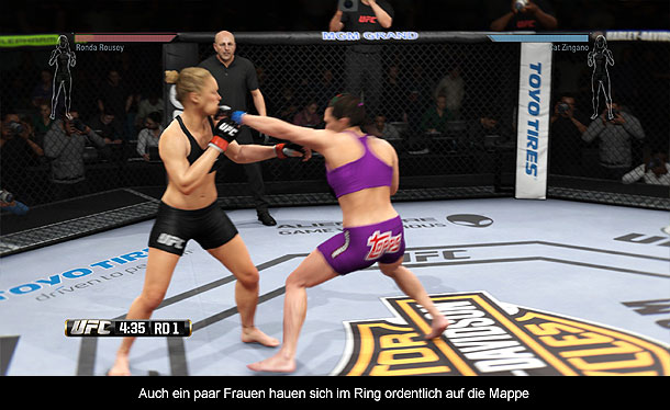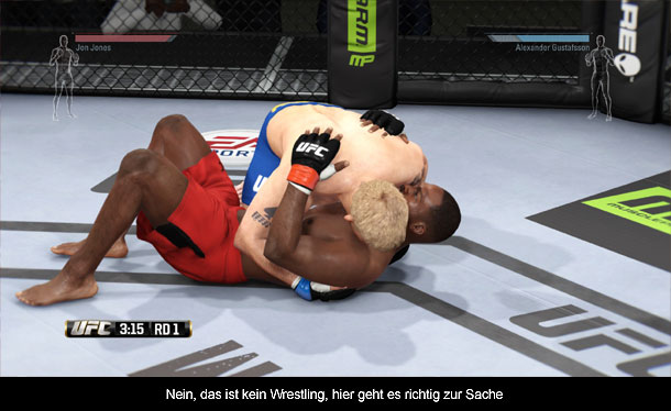 Im Zentrum von EA Sports UFC steht natürlich das Gameplay, denn damit steht und fällt letztlich der Titel. Dabei ist das keine triviale Aufgabe, denn es gibt Tritte, Schläge, Elemente aus dem Ringen oder Thai-Boxen und noch vieles mehr. Daher ist die Steuerung auch ziemlich komplex ausgefallen. So stehen die vier Aktionstasten für die vier Gliedmaße und man verteilt damit simple Schläge und Tritte. Für feinere Attacken gibt es die Schultertasten und den linken Analogstick, womit man z.B. auch Uppercuts oder Roundhouse-Kicks verteilen kann. Wer möchte kann aber auch den Gegner greifen oder auf den Boden werfen und ihn dann aus nächster Nähe bearbeiten, um ihn auf dem Boden zur Aufgabe zu zwingen, indem man beispielsweise den Arm so einklemmt, dass ein Bruch droht. Hier kommt dann eine Art Minispiel zum Einsatz, in dem die Spieler je nach Richtung einen Balken aufladen und entweder stärker zugreifen oder eben den Angriff abwehren können. Meist ist auf Grund der Einfachheit der Verteidigung derjenige dann auch im Vorteil bei solchen Dingen und man ist besser damit bedient ein KO zu erzwingen. Daher ist es wichtig auch die Block-Mechanik zu verinnerlichen, die, wenn richtig getimt, zu gefährlichen Kontern genutzt werden kann. Wie man also sieht gibt es extrem viele Facetten im Gameplay, die es leider auch extrem kompliziert machen und die Steuerung unterstützt dies noch. Denn je nachdem ob man steht, auf dem Boden ringt oder im Thai-Clinch ist, können Tasten leicht andere Angriffe auslösen und diese sind meist eh schon doppelt und dreifach belegt. Somit wird man zu Beginn des Öfteren verlieren, weil das Spiel einem vor allem in der Verteidigung kaum Fehler verzeiht und dabei einen relativ schlechten Job bei der Vermittlung der Steuerung macht. Man muss sich selbst durchkämpfen und wird dann mit einem durchaus taktischen Gameplay belohnt. Leider werden die meisten Kämpfe aber durch ein KO entschieden, statt durch Submissions, was im echten Sport nicht ganz so häufig vorkommt. Dies liegt in erster Linie an der zu simplen Abstrahierung des Systems, was den Verteidigern viele Vorteile liefert. Etwas enttäuschend ist auch die Unterscheidung der einzelnen Kampfstile. Denn egal ob man einen Boxer oder einen Ringer auswählt, letztlich kann jeder die gleichen Moves und man kommt mit immer derselben Kampftechnik zum Ziel. Ebenso fehlt ein entsprechendes Feedback über Treffer. Denn obwohl man den Gegner mit Schlägen und Tritten bearbeitet, kommt dieser nicht einmal ins Taumeln, obwohl gerade ein 120 Kilo Monster ihn mitten im Gesicht getroffen hat. Das sorgt dafür, dass man auch kaum ein Gefühl dafür hat, ob der Gegner kurz vor dem KO ist oder nicht. Denn eine Lebensanzeige gibt es nicht, sondern nur eine Ausdaueranzeige und eine Anzeige über die schwere der Treffer in Körperregionen. Wirklich repräsentativ für die Verfassung des Gegners ist aber nichts und so reichen manchmal vier Treffer für ein KO und manchmal nicht mal 30 und man fragt sich verwundert, wieso. Etwas mehr Feedback wäre hier wirklich wünschenswert.