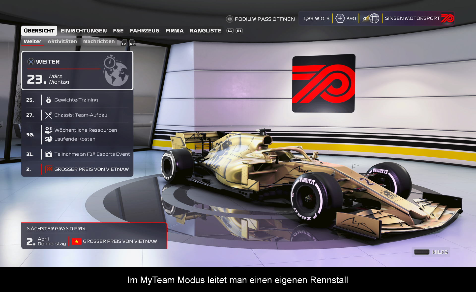 Bevor es dann endlich losgeht, schauen wir uns noch an was der Fahrermarkt so alles hergibt. Dabei habe ich mich für das hoffnungsvolle Talent Mick Schumacher entschieden. Als zweiter Fahrer kann er so Erfahrung sammeln und wir können im Laufe der Saisons die uns noch so bevorstehen, mit anderen Teams verhandeln sofern da Interesse bestehen sollte und ihn für gutes Geld abgeben. Das bringt einerseits Geld in die Kassen und wir haben die Möglichkeit das Team weiter zu entwickeln mit einem anderen Fahrer, der schon mal Weltmeister war. Nicht zu vergessen, dass wir unser Team im Hintergrund auch verbessern müssen. Der Motor liefert die Kraft, aber genauso ist es wichtig, die Aerodynamik weiter zu entwickeln, so dass wir entsprechende Abteilungen immer weiter ausbauen, damit wir auch konkurrenzfähig werden. Eines sollte klar sein, das wir als frisches Team nicht unbedingt um den Sieg fahren, versteht sich von selbst. Als Besitzer müssen wir dafür sorgen, alles aus dem Team rauszuholen, was man rausholen kann. Dabei stehen uns diesmal Aktivitäten zur Verfügung, bedeutet zwischen den Grand Prix, können wir an freien Tag unterschiedliche Termine wahrnehmen. Ein Sponsorenevent? Klar, wir schicken unsere Leute dorthin, das sorgt dafür das wir mehr Geld in die Kassen bekommen. Alternativ können wir auch unser Mechaniker Team auf eine Podiumsplatz-Party schicken, das dafür sorgt, das die Moral weiter steigt und sie dadurch besser arbeiten. Und das Schöne am MyTeam Modus ist, dass es nicht eben nur eine Saison geht, sondern wir 10 Jahre fahren können um uns und unser Team stetig weiter entwickeln zu können.