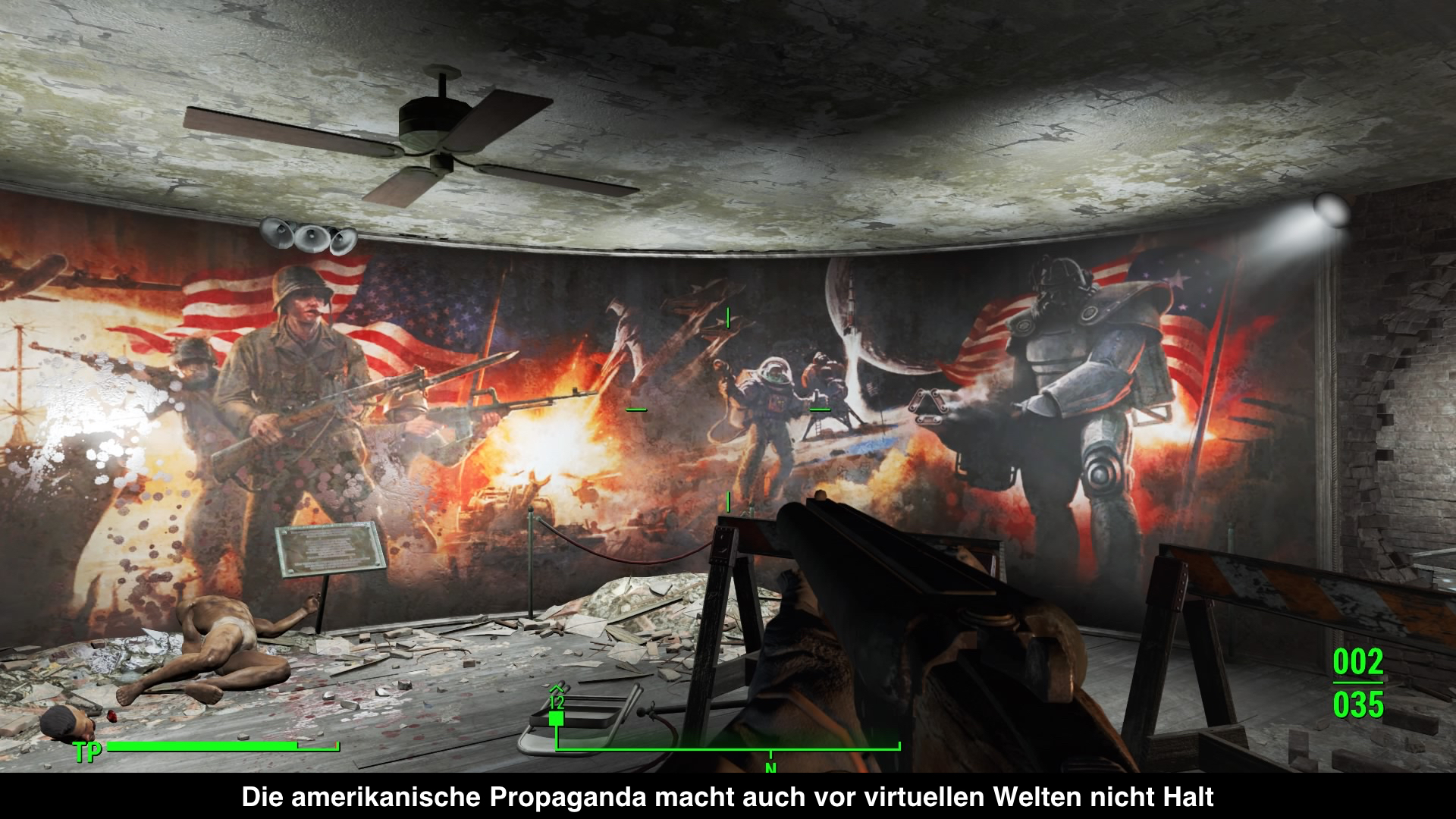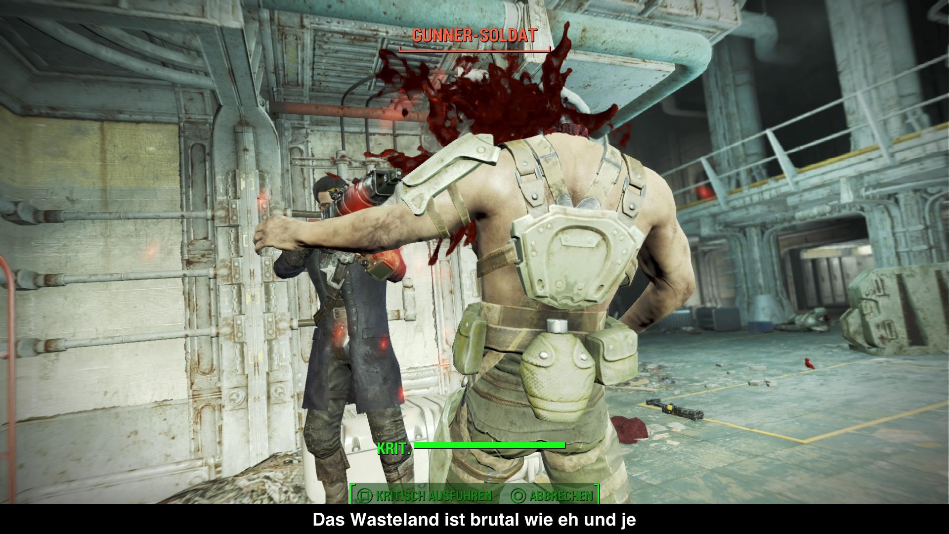 Gameplaytechnisch erinnert es stark an seine Vorgänger Fallout 3 und New Vegas, was jedoch nichts Schlechtes ist. Ihr habt die Möglichkeit zwischen 3rd-Person oder Ego-sicht zu wechseln. Euer Menü mit Landkarte, Inventar, Quests und nahezu allem anderen bietet euch euer Pip-Boy. Die Konstruktion von Vault-tec ist wie eine riesige Smartwatch, die euch einige Funktionen bietet. Ihr könnt hier auch eure Skill-Punkte Verteilen und neue Fähigkeiten erwerben. Hier gibt es enorm viele Möglichkeiten euren Charakter zum Überlebenskünstler zu machen. Ihr könnt euch den Skill Kannibale aneignen, so könnt ihr durch Menschenfleisch Gesundheit zurückgewinnen. Ihr könnt aber auch eure Schloßknacker und Hackerfähigkeiten leveln um alles, was nicht gut genug gesichert ist, plündern zu können. Aber es gibt noch viele andere Fähigkeiten die euch das Leben erleichtern oder euch neue Optionen aus einer scheinbar ausweglosen Situation bieten. Neben dem altbekannten Pip-Boy ist auch das V.A.T.S. wieder dabei. Dieses System erlaubt euch, im Zeitraffer einzelne Körperteile des Gegners auszuwählen. Nach Knopfdruck nimmt es diese gezielt unter Beschuss. So könnt ihr auch in hektischen Situationen den Überblick bewahren und jedem um euch in Sekundenschnelle einen gezielten Kopfschuss verpassen. Dabei sei nur nebenbei erwähnt, das Spiel ist definitiv uncut. Der Kopf platzt oft in alle Einzelteile und verteilt sich auf dem Boden oder der Wand. Nichts für schwache Gemüter, aber es ist ja auch an das erwachsene Publikum gerichtet.