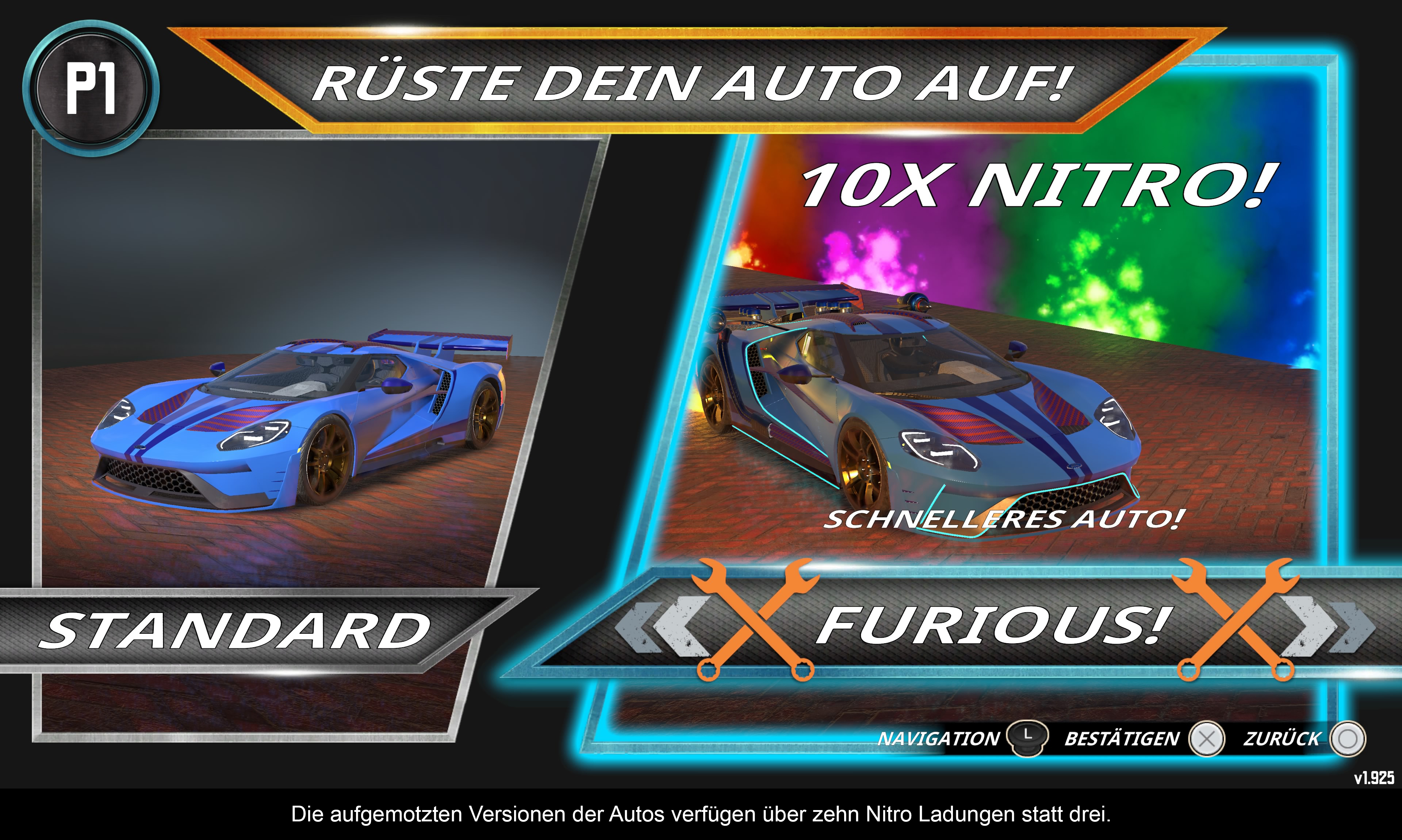 „Fast & Furious Arcade Edition“ bietet nicht viel Auswahl. Es gibt einen Einzelspielermodus und einen Versus-Modus für Mehrspielerrennen im Splitscreen-Modus. Es stehen acht Fahrzeuge zur Verfügung – zumindest anfangs. Diese sind allesamt lizenziert und umfassen Fahrzeuge wie den ikonischen Dodge Charger aus den 1970er Jahren, eine Corvette Z06, einen Ford GT oder einen Ford Bronco DR. Alle Fahrzeuge besitzen unterschiedliche Spezifikationen und unterscheiden sich leicht in Bezug auf Beschleunigung, Geschwindigkeit usw. voneinander. Schafft man es, mit einem Auto alle Strecken zu meistern, wird die extreme Variante dieses Autos freigeschaltet. Das ist eine aufgemotzte Tuningversion mit 10-facher statt 3-facher Nitro-Leistung. Abgesehen von der Farbe lässt sich nichts verändern.