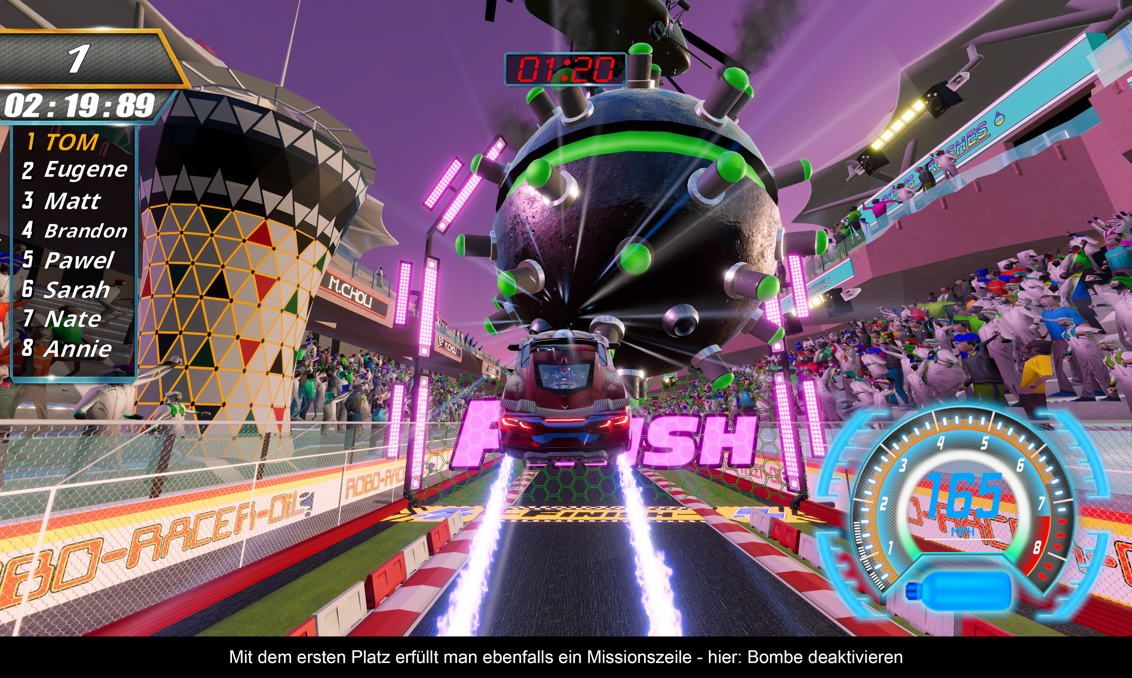 Zum Gameplay gibt es nicht wirklich viel zu sagen. Die Bremse braucht man eigentlich nicht, über die Taste X lässt sich das Nitro zünden. Wenn man die R2-Taste, auch Gas-Taste genannt, zweimal kurz hintereinander betätigt, kann man Drifts oder Wheelies auslösen. Die Steuerung reagiert insgesamt recht nervös, was sich jedoch in den Optionen anpassen lässt. Beim Automaten-Original kommen zudem noch starke Force-Feedback-Effekte und natürlich ein richtiges Lenkrad hinzu. Beides fehlt in der Konsolenversion. Dadurch geht natürlich auch ein bisschen das Feeling verloren. Die Strecken sind zwar mehr oder weniger Rundkurse, aber es gibt keine Streckenkarte o. Ä. Meistens schalten sich in der zweiten Runde verschiedene Abkürzungen frei und es explodiert immer irgendetwas. Da es nur nach vorne geht, muss man die Positionen der Abkürzungen und Rampen auswendig lernen, denn sie machen den Unterschied zwischen Sieg und Niederlage. Letztlich zählt nur der erste Platz bzw. der Abschluss der jeweiligen Mission (zum Beispiel eine Rakete stoppen oder eine Drohne zerstören). Wenigstens reagiert die Kollisionsabfrage recht gnädig. Egal, ob man gerade einen Konkurrenten abdrängt oder durch ein Gebäude geschleudert wird: Hängen bleibt man nirgends, was möglichem Frust vorbeugt. Trotzdem kann es nervig werden, denn obwohl die Kurse in die Kategorien Einfach, Mittel und Schwer unterteilt sind, ist es oftmals doch eher eine Frage des Glücks, ob man gewinnt oder nicht. Immerhin warten am Ende Leaderboards, in denen man seine Zeiten einordnen kann.