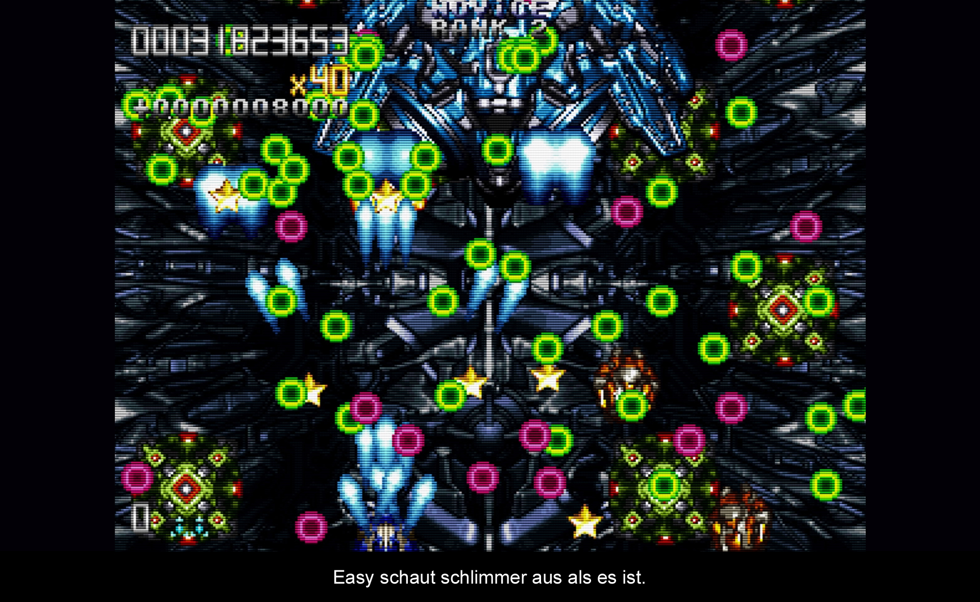 Wie im Genre üblich, gibt es keinerlei Hintergrundgeschichte und man wird nach der Wahl von einem der vier Schwierigkeitsgrade sofort ins Geschehen geworfen. Ok, vorher bekommt man noch ein kleines Tutorial vorgesetzt, welches man später natürlich auch überspringen kann. Um euer Schiff heil durch die sechs Level des vertikal scrollenden Bullet Hell Shmups zu manövrieren, bedarf es neben der Nutzung von drei Buttons vor allem einer ruhigen Hand und eines guten Auges. Das besondere an eurem Schiff ist dabei, dass ihr nicht nur nach vorn, sondern auch nach hinten schießen könnt und müsst. Ganz nebenbei steht euch hier keine alles vernichtende Smartbomb in brenzligen Situationen zur Verfügung, sondern nur zwei Schilde, dessen Handlings nicht ganz einfach sind. Zum einen habt ihr eine Energieleiste, welche sich auffüllt und zum anderen ein Schild, welches man manuell aktivieren muss. Kollidiert ihr zum Beispiel mit einem gegnerischen Schiff oder Hindernis, dezimiert sich die Energieleiste und ihr verliert bei null eure Schilde. Gegnerische Projektile sind davon jedoch ausgeschlossen und zerstören euer Schiff sofort. Seit ihr also kurz davor im Kugelhagel unter zu gehen, müsst ihr das Schild manuell betätigen. Das System hebt sich von anderen Genrekollegen ab und kann schon mal ein Leben retten, wenn man nur ein Hindernis touchiert. Im Gegensatz zu herkömmlichen Smartbombs, gibt es nach jedem Ableben zwei neue Schilde für euer Schiff.