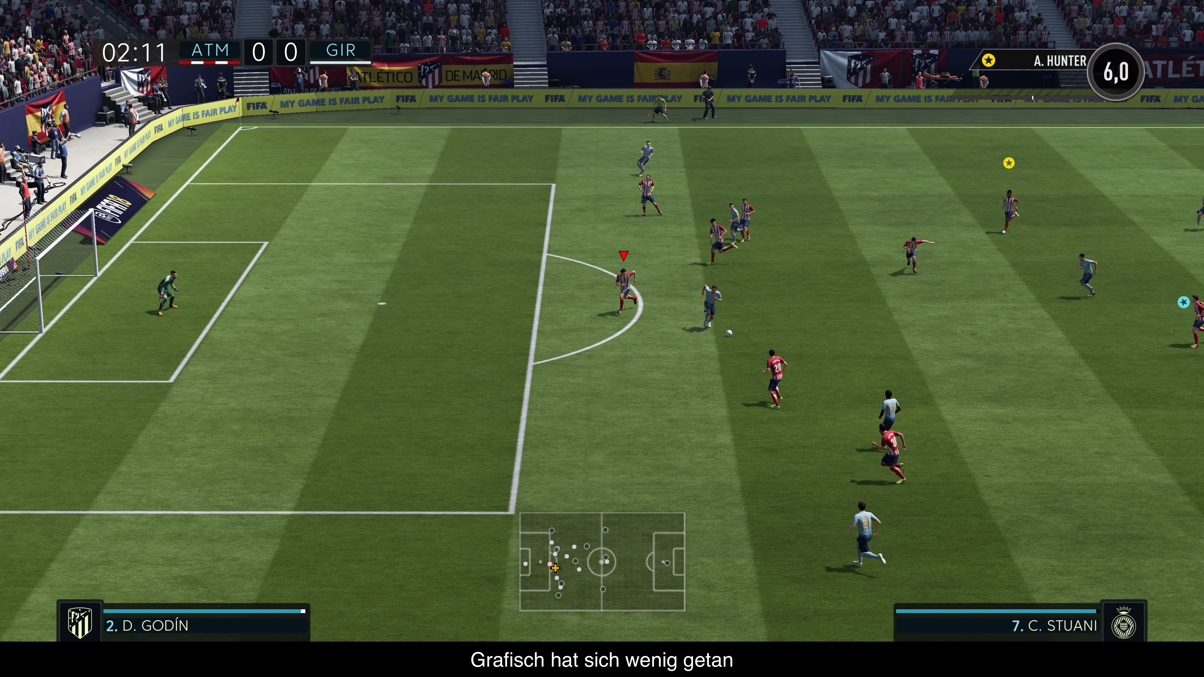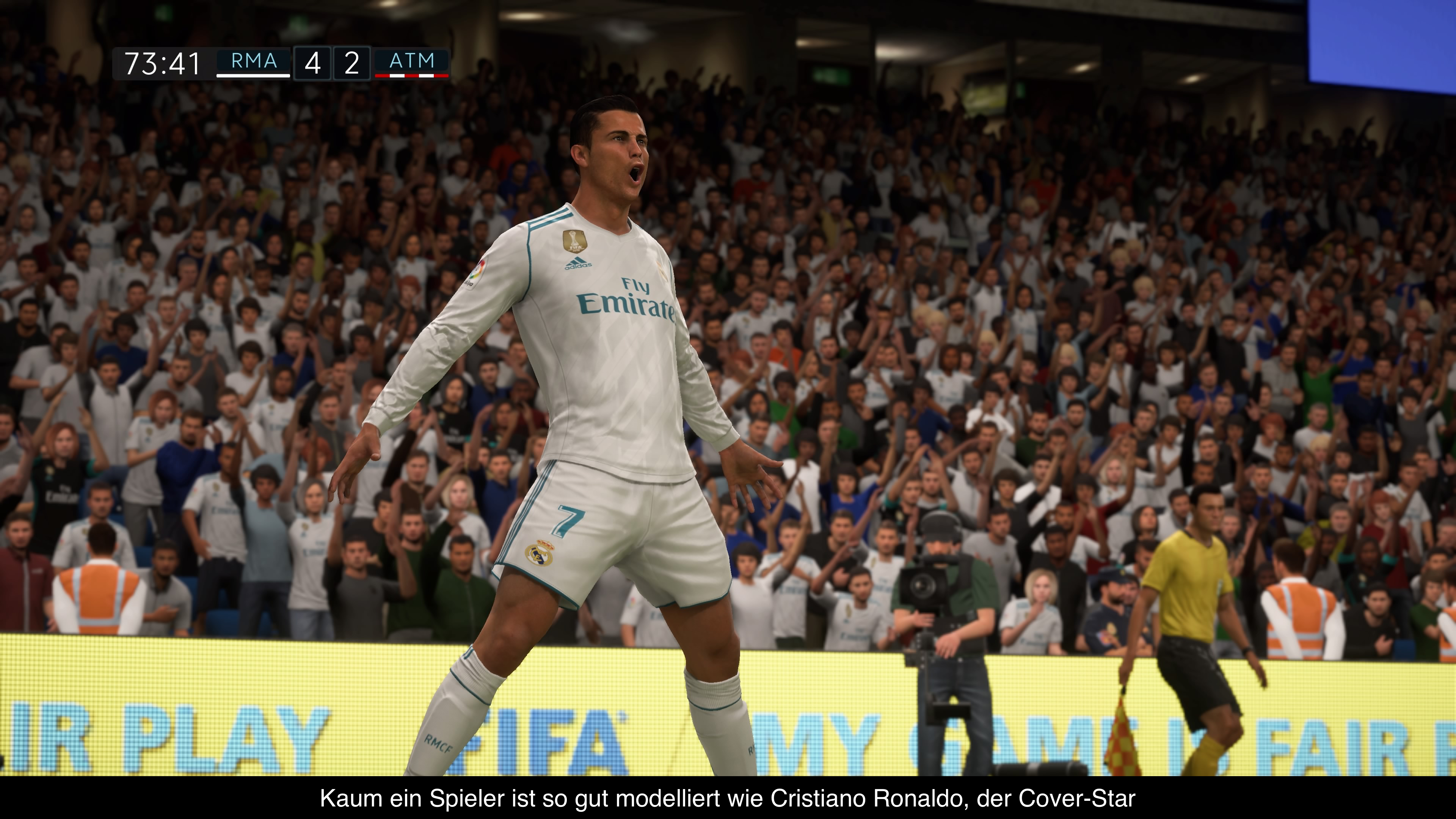 Ein Punkt, wo FIFA 18 glänzen kann, ist definitiv die Atmosphäre. Hier macht man keine Kompromisse und fängt den Wahnsinn des Fußballs perfekt ein. Das fängt zum Beispiel bei den Fans ein, die noch abwechslungsreicher sind und nun im Spiel auf die Spielaktionen mit Buhrufen oder Klatschen reagieren. Bei Toren passiert es auch schon mal, dass die Menge auf der Stehtribüne hinter dem Tor völlig ausflippt und sich zum Spielfeldrand drängt, um mit dem Spieler zu feiern. Solche Dinge sind wirklich gelungen. Auch die Kommentatoren machen einen guten Job und erzählen vielerlei interessante Infos, die zu den spielenden Mannschaften passen. Leider wiederholt sich einiges davon etwas zu häufig. So kann ich gar nicht mehr hören, wie oft das Stadion von Atletico Madrid neu gebaut wurde. Leider passen die Kommentare auch nicht immer ganz zum Spielgeschehen. Da wird dann schon mal vom Einwurf geredet, während der Ball weit und breit nicht im Aus ist. Übrigens ist der The Journey Modus nun von Haus aus auch auf Deutsch spielbar. Die Stimmen sind alle gelungen und Stimmen von Spielern wie Thierry Henry sind weiterhin auf Englisch mit Untertiteln. Wer möchte kann aber die Stimmen auch gegen die englischen austauschen.