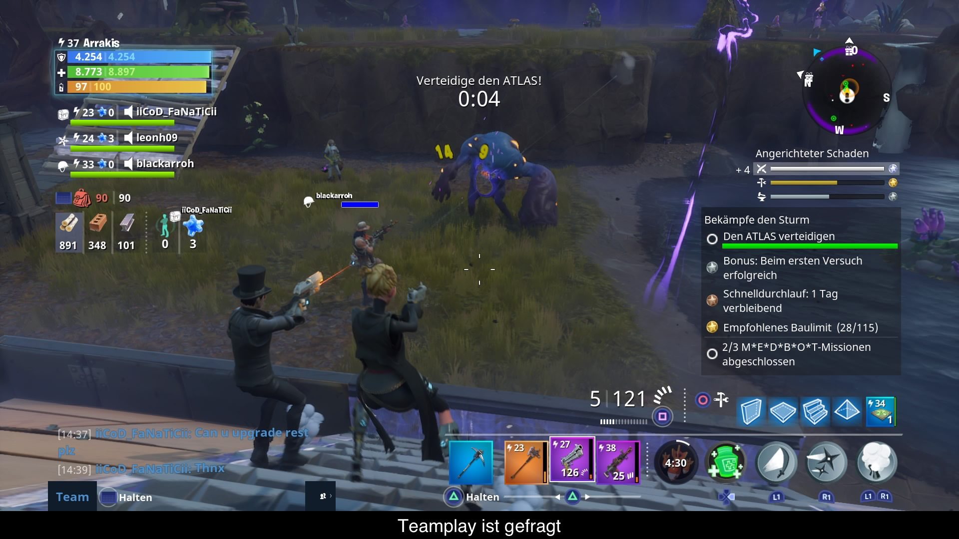 Ich bin auf Fortnite nur gestoßen, weil ich auf der Suche nach einem schnellen und unkomplizierten Spiel war. Die 20 bis 30 Minuten Rundenzeit waren sehr verlockend und ich neige nicht dazu, in die üblichen F2P-Fallen zu tappen, somit gab ich dem Spiel eine Chance. Mittlerweile logge ich täglich ein, um einen Bonus zu kassieren, bin auf Level 30 und hab zahlreiche Waffen und Helden. Die Suchtspirale von Fortnite hat mich voll erwischt und das schöne dabei ist, bis auf das Starterpaket wurde kein einziger Cent investiert. Die generelle Struktur ist sehr gönnerhaft zu den Spielern und es hilft, dass es technisch einwandfrei läuft. Ein Spiel zu finden funktioniert jederzeit (sofern nicht die Server gewartet werden) und das generelle Gameplay ist sehr zufriedenstellend. Ich muss aber gestehen, dass meine Ansprüche sehr gering sind. Es nervt, dass man in den ersten 15 Minuten durch die Karte läuft nur um Ressourcen abzubauen und BlueGlo zu finden. Lustig wird es erst in der Fort-Phase, wenn man mit anderen Mitspielern an der Verteidigung arbeitet. Zwar läuft dies auch immer gleich ab, aber der konstante Gegnerschwall lässt kaum Zeit zum Denken. Hier schnell das Fort ausgebessert, noch eine bessere Waffe gebastelt und kümmert sich überhaupt jemand um den dämlichen Hüllenwerfer? Schon sind wieder 10 Minuten um und die Runde ist vorbei. So belanglos wie es scheint, kippt man doch in dieses Spiel. Die erhaltenen Erfahrungspunkte werden gleich in Unterstützer, Waffen und Helden investiert. Es ist eine kleine Wissenschaft hier die optimale Kombination zu finden und diese beschäftigt auch wieder 10 Minuten. Das Spiel hat eine sehr interessante Suchtspirale geschaffen. Es hilft auch, dass man dank den Events und Battle Royal aus der Handlung ausbrechen kann. Man muss sich schon etwas motivieren die immer gleichen Missionen zu bewältigen. Zudem sollte man etwas überlegter vorgehen, wenn man nicht auf die Pay-Wall treffen will. Es schadet nicht, sich auf einen Helden und Waffe zu fixieren und nicht unüberlegt seine Ressourcen zu verteilen. Epic Games hat viel Zeit und Energie in dieses Spiel investiert und es scheint nicht, als würde man es aufgeben wollen. Das Spiel hat zahlreiche Verbesserungen erfahren und man nimmt die Community ernst. Auch der Erfolg von Battle Royale zeigt ihnen, dass sie auf den richtigen Weg sind. Mit dem Umstieg zu F2P wird es sich zeigen ob sie ihr Publikum halten können. Warframe hat bewiesen, dass sich ein Communtiy freundliches F2P System für Entwickler und Spieler gleichermaßen lohnt. Wer sich von den ganzen Menüs und dem F2P Gedanken nicht abschrecken lässt, kann dem Spiel eine Chance geben. Der Coop funktioniert und das Gameplay passt! Somit, bekämpfen wir gemeinsam den Sturm!