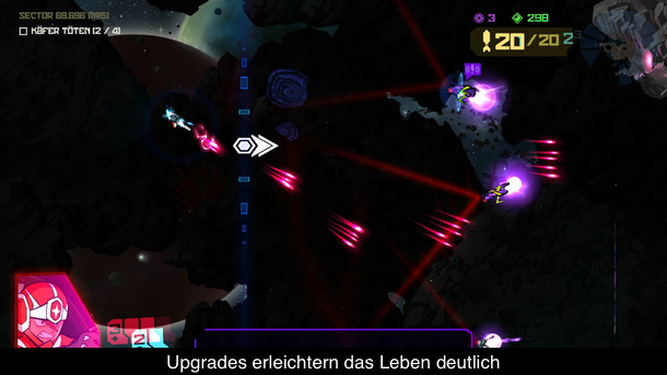 Die Geschichte von Galak-Z ist relativ nebensächlich und schnell erzählt. Ihr schlüpft in die Rolle von A-Tak und seid irgendwo in der Galaxie gestrandet. Also müsst ihr nun insgesamt 25 Missionen bestreiten, um in eure Heimat zurückkehren zu können und dafür diverse Missionen erledigen. Spielerisch stellt sich Galak-Z als eine 2D Space-Sim vor und nimmt den Sim-Aspekt durchaus ernst. Denn wenn ihr euer Schiff in eine Richtung mit eurem Boost schickt, dann bleibt es auch auf diesem Pfad, wie eben im Weltall üblich. Man muss also nicht ständig boosten, sondern nur für Richtungsänderungen. Das klingt zwar sehr simpel, benötigt aber einiges an Gewöhnungszeit. Boosten kann man sowohl vorwärts, als auch rückwärts und nach oben vom Schiff aus gesehen. Diese Fähigkeiten sollte man auch gut beherrschen, denn spätestens im Kampf mit feindlichen Raumschiffen oder Gegnern sind diese überlebenswichtig. Wie man selbst, können die meisten Gegner nämlich Raketen oder Laserwaffen abschießen und dann ist Koordination gefragt. Einerseits muss man den Laserwaffen ausweichen und auch selber dem Gegner Schaden zufügen. Zum Teil kommt es hierbei zu recht unfairen Situationen, wenn mehrere Gegner gleichzeitig gegen einen kämpfen und man lieber schnell das Weite suchen sollte. Das Unfaire wird noch durch den Rogue-Anteil im Spiel verstärkt. Denn die 25 Missionen des Spiels sind in fünf Staffeln mit je fünf Missionen aufgeteilt und sobald man einmal in einer Mission das zeitliche gesegnet hat, muss man die komplette Staffel von vorne beginnen. Und als wäre das schon nicht schlimm genug, nimmt man euch jegliche Schiffsupgrades wieder weg, die ihr seit dem Staffelbeginn eingesammelt hat. Gewöhnt euch also nicht zu lange an eure Superlaser und Geschwindigkeitsupgrades. Ihr dürft also nicht nur von vorne beginnen, sondern steckt wieder in dem jungfräulichen und unterlegenen Schiff, wie vor einer Stunde. Es ist aber nicht mal möglich sich an die Level zu gewöhnen, da die Level und Missionen relativ zufällig gewählt werden. In einem Durchgang könnt ihr dann also relativ problemlos bis Mission 5 einer Staffel kommen, um dann einen schweren Gegner vor euch gesetzt zu bekommen und im zweiten Durchlauf ist direkt in Mission 1 Schluss. Im Kern wird man also an jeder Ecke doppelt und dreifach bestraft.