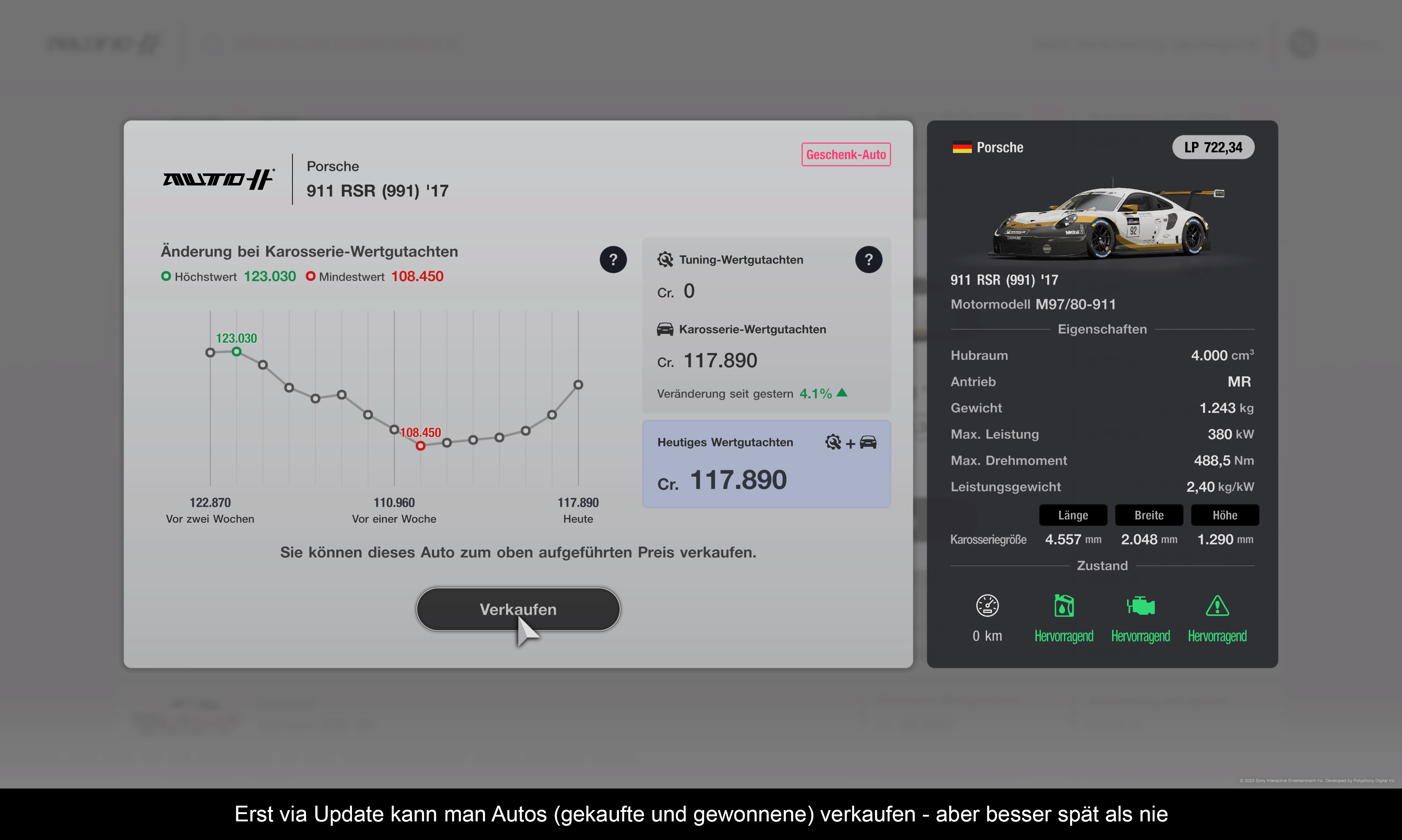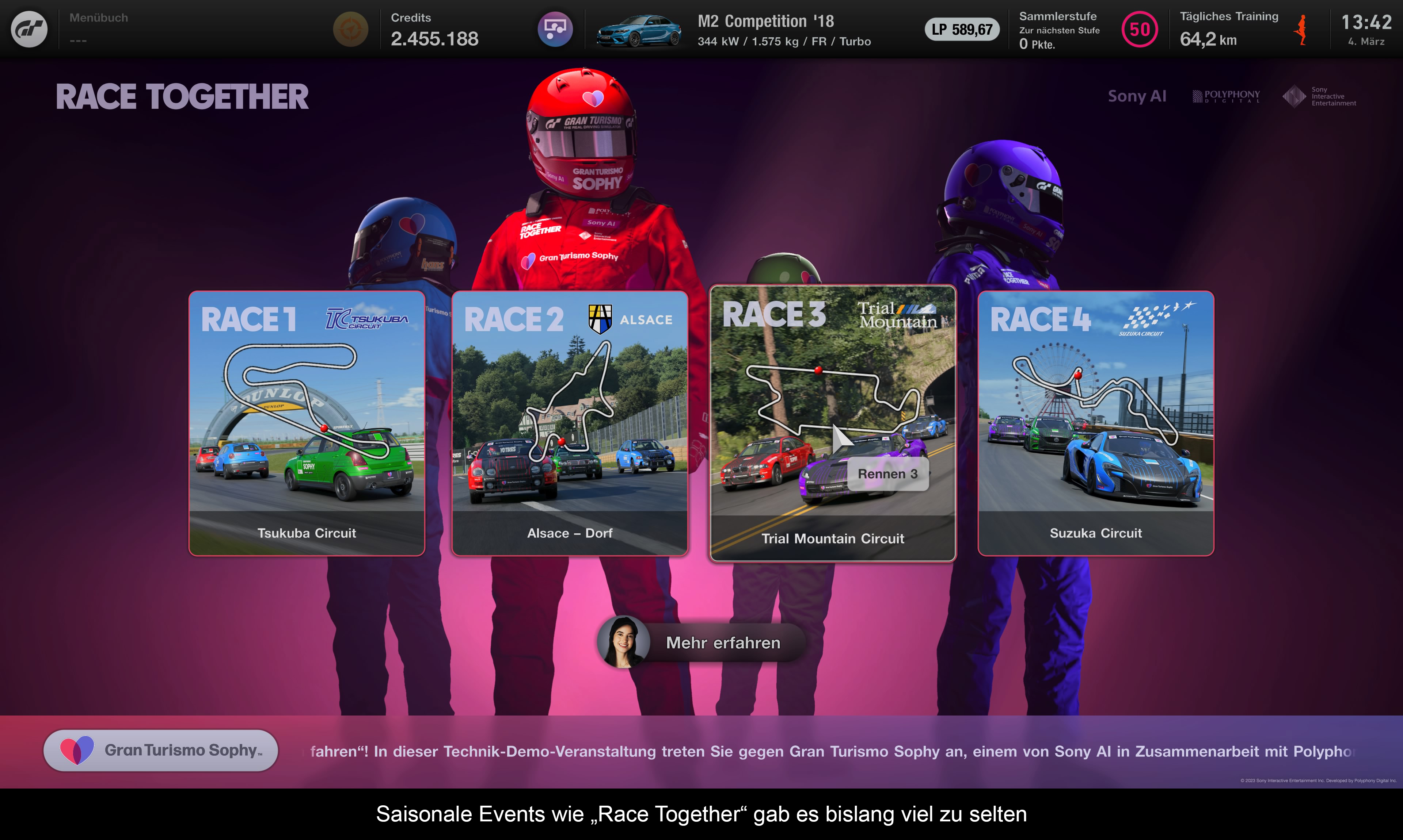 In dem vergangenen Jahr hat das Spiel fast jeden Monat ein kostenloses Inhalts-Update bekommen. Diese haben neue Fahrzeuge enthalten, es gab neue Kurse oder Layouts, neue Events auf den Weltstrecken, neue Menübücher für das GT Café und auch ein paar neue Gameplay-Features. Zum Beispiel kann man seit letztem Herbst auch Autos wiederverkaufen. Das ist sogar ganz nett als Meta-Game aufgezogen, wo Preise munter hoch und runtergehen. Ebenfalls wurde im Februar 2023 Update das Spiel fit für die PSVR2 Virtual Reality Brille gemacht. Dieses Mal auch fast ohne Einschränkungen (lediglich der lokale Splitscreen-Modus funktioniert nicht). Zudem wurde sogar noch ein VR-Showcase Modus hinzugefügt, in dem man seine Autos von allen Seiten bewundern kann. Warum das nicht auch im 2D Modus möglich ist, bleibt ein Geheimnis der Entwickler. Nicht jeder Fan will sich ein 650€ teures Gimmick kaufen. Insofern gut für Spieler, die sich für VR interessieren und das nötige Kleingeld parat haben, alle anderen haben davon keinen Mehrwert. Spannender ist dagegen die Integration von Sonys Künstliche Intelligenz Initiative GT Sophy. Man konnte in den vergangenen Monaten bereits einiges darüber lesen. Mit dem letzten Update lässt sich das Ganze jedoch auch selbst erleben. Schaut euch dazu einfach mein Video an. Mein Fazit bislang – das kann was ganz Großes werden. Endlich keine dummen KI-Gegner mehr und endlich – egal auf welchem Schwierigkeitsgrad – spannende Rennen. Doch bislang handelt es sich nur um ein zeitlich begrenztes Experiment und man muss abwarten, was tatsächlich daraus entwächst. Nebenbei gab es natürlich auch allerlei Bugfixes, BOP Anpassungen, neue Museums-Einträge, andere kleine Features und neue Scapes. Meckern kann man also nicht – zumal alles kostenlos ist – aber warum es trotzdem wenig mit einem „Games as a Service“ Game zu tun hat, kläre ich im nächsten Absatz.
