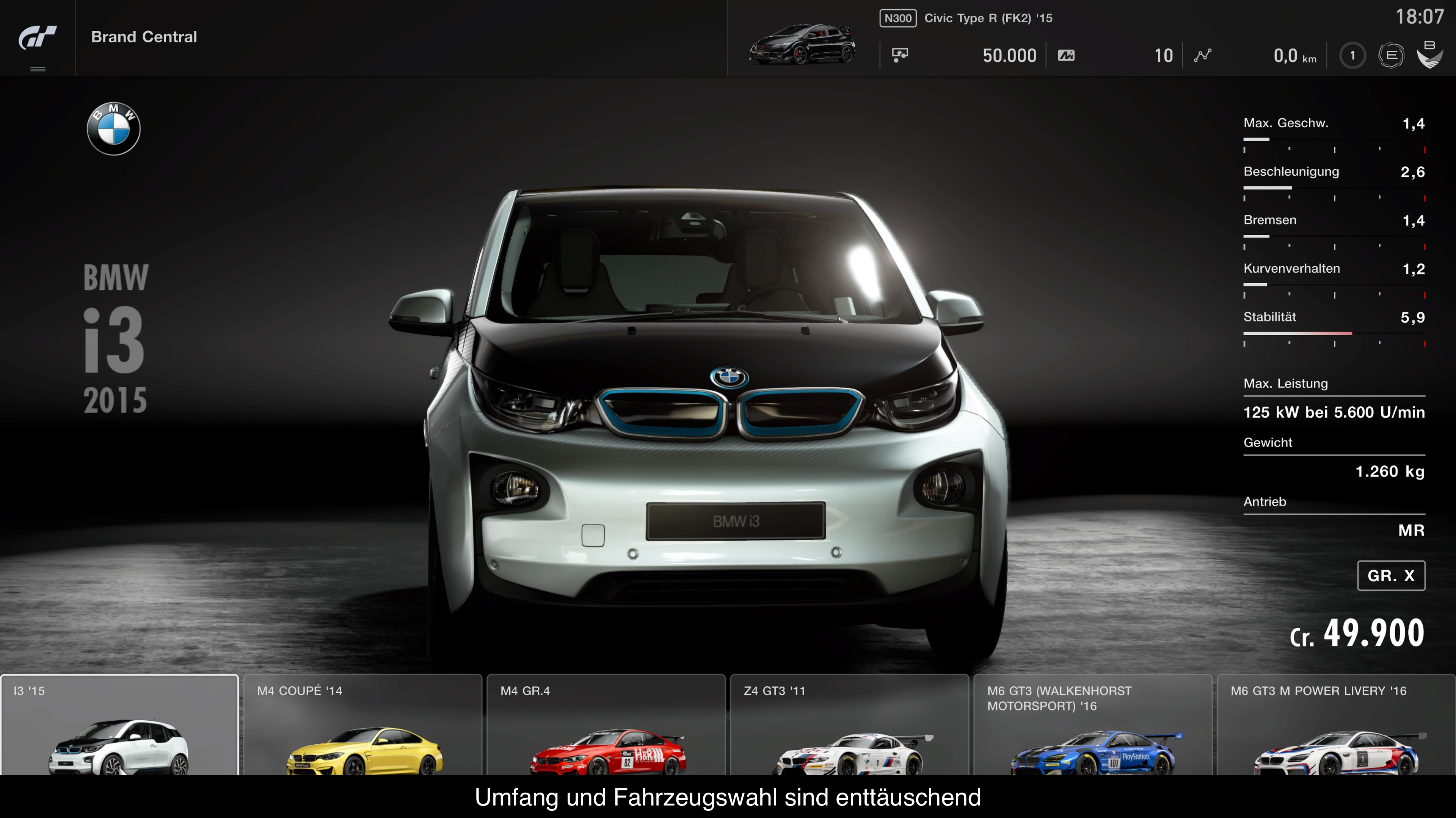 Gran Turismo 4 hatte über 700, Gran Turismo 5 hatte über 1000 und Gran Turismo 6 hatte sogar 1197. Die Rede ist natürlich von Fahrzeugen und sicherlich gab es einige Fahrzeuge in mehrfacher Ausführung, wie den Nissan Skyline GT-R. Aber unterm Strich gab es fast alles, was Rang und Namen hatte. Dies ändert sich mit Gran Turismo Sport gravierend. So gibt es nur 163 Fahrzeuge von den namhaftesten Herstellern, unter anderem auch erstmalig Porsche. Dafür fehlen aber andere Hersteller, wie zum Beispiel Pagani, Opel oder Chrysler. Zudem gibt es einige fragwürdige Fahrzeugentscheidungen. So gibt es z.B. unter den wenigen BMWs den elektrischen i3, statt eines i8. Auch ist die Fahrzeugauswahl fast durchgehend sehr aktuell, wodurch zahlreiche Klassiker fehlen. Eines der ältesten Fahrzeuge dürfte der Audi Quattro sein. Bei Strecken sieht es ähnlich aus. Es gibt alte Bekannte, wie die Nordschleife und neu hinzugekommen ist zum Beispiel Dragon Trail, aber dafür fehlen einige alte Klassiker, wie Laguna Seca. Insgesamt gibt es 40 Streckenlayouts auf 17 Kurse verteilt.