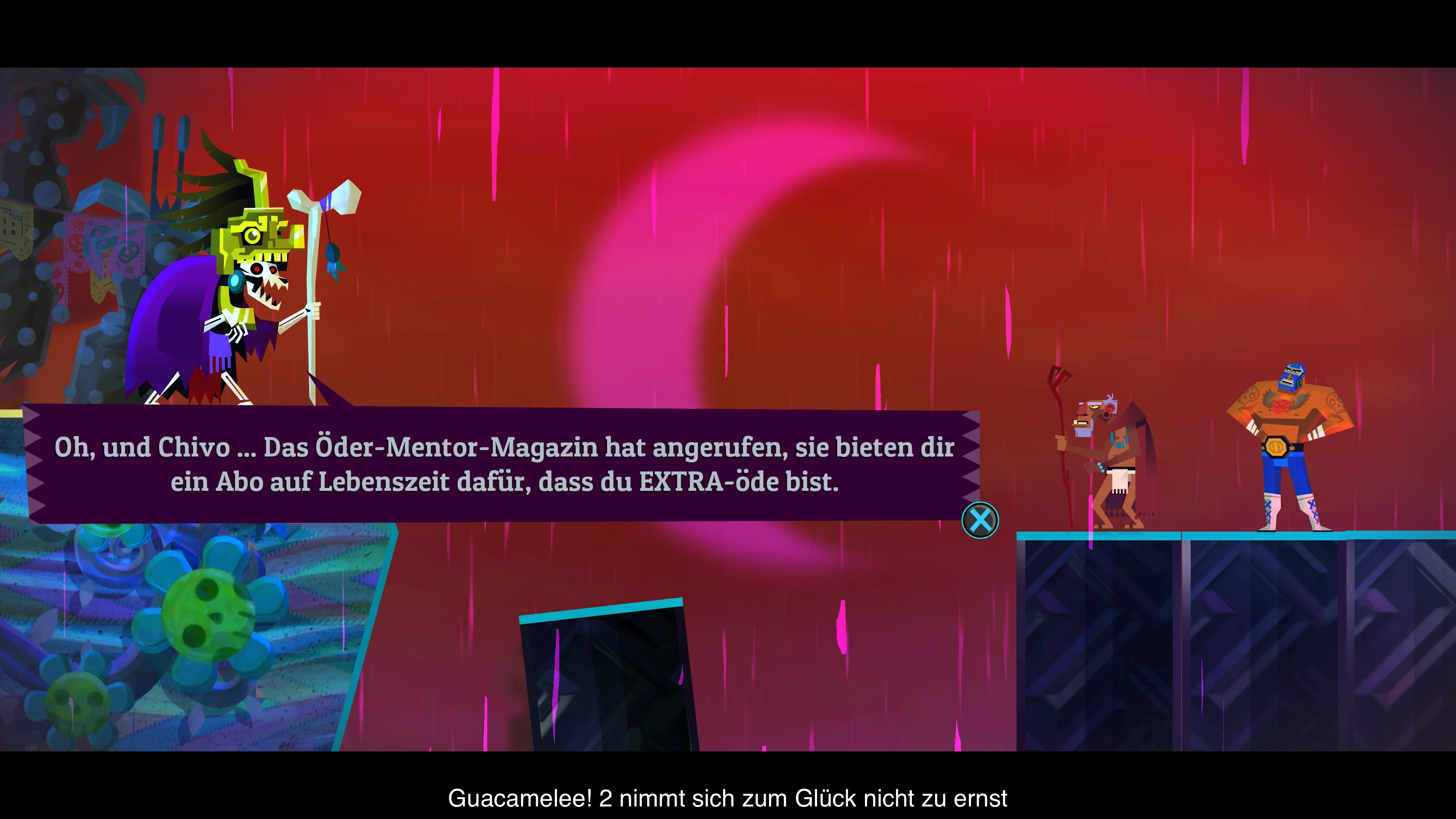 Wenn man es ganz nüchtern betrachtet, könnte man sagen das es bei Guacamelee! 2 einfach mehr vom Gleichen gibt. Neue Umgebungen, gleiche Fähigkeiten, einen Mehrspielermodus und fertig ist der Nachfolger. Das wird dem Spiel aber nicht gerecht, denn auch wenn sich manches sicher mehr abheben könnte, ist das Spiel immer noch ein grandioser Vertreter des Genres. Im Vergleich zum Vorgänger sind die Jump’n Run Passagen noch kniffliger geworden und trotzdem erwischt man sich dabei sie dann doch noch mal zu versuchen, weil es einfach Spaß macht seine Fingerfertigkeit zu testen. Auch die Geschichte mit dem Humor sorgt für den ein oder anderen Lacher und ist eine gelungene Abwechslung zu all den ernsten Spielen, die derzeit erscheinen. So wird Guacamelee! 2 sicher nicht das Genre revolutionieren, aber es macht einfach Spaß und ist für Fans des Vorgängers und Genres ein Muss.