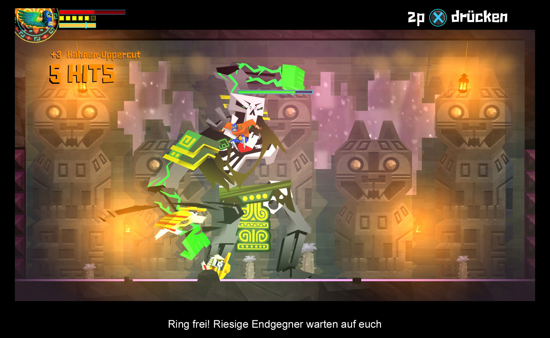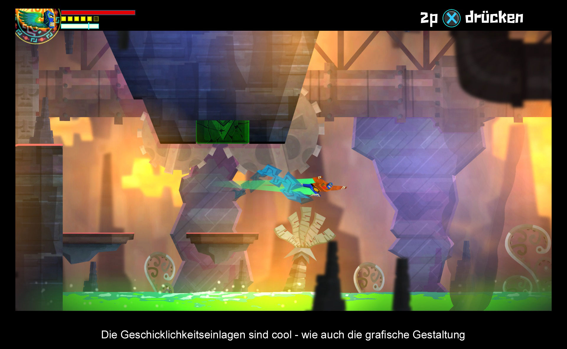 Als kräftiger Luchador der die Welt vor dem bösen Calaca retten möchte, müsst ihr natürlich ordentlich austeilen. Deshalb wandert ihr durch eine wunderschöne 2D-Welt mit vielen Gebieten und müsst immer wieder gegen Gegner kämpfen. Dabei stehen euch kleine Combos zur Verfügung, die gekonnt aneinander gereiht werden möchten. Denn zu Anfang sind die Gegner noch bestenfalls Kanonenfutter, doch irgendwann kommen auch stärkere Gegner auf euch zu, die euer gesamtes Können abverlangen, weil sie nur mit bestimmten Angriffen verwundbar sind oder euch mit zahlreichen Angriffen in gefährliche Situationen bringen. Das Kämpfen ist jedoch nur ein Teil des Spiels, denn oftmals werden die eigenen Fähigkeiten auch mit zahlreichen Geschicklichkeitseinlagen getestet. Bewegende Plattformen, Gegner und Lava sind da noch das geringste Problem und sorgen dafür, dass man genau abgestimmte Sprünge landen muss, um weiterzukommen. Teilweise ist der richtige Weg nicht immer offensichtlich und man muss erst etwas herumprobieren. Leider geht die Steuerung nicht ganz so gut von der Hand, wie noch damals auf der Vita. So machen vor allem die Superangriffe Probleme, wenn man eine Richtungstaste mit der Kreis-Taste kombinieren muss. Viele Eingaben werden nicht erkannt und führen zu unnötigen Toden. Warum dies aber mehr Probleme bereitet, als auf der Vita, können wir nicht sagen. Möglicherweise gibt es noch einen kleinen Fehler in der Review-Version. Mal von diesen ärgerlichen Problemen abgesehen, bleibt das Spiel aber immer fair und versucht euch mit den Aufgaben herauszufordern und nicht mit unendlich vielen Gegnern. Besonders herausfordernd sind dabei die Endgegner, welche oftmals die perfekte Beherrschung der Steuerung voraussetzen. Wer aber die Angriffsmuster der Gegner auswendig lernt, sollte schon einen großen Vorteil besitzen. Wer möchte kann auf der PS4 das Spiel auch zu zweit spielen! Dann übernimmt der zweite Spieler die Rolle eines weiblichen Luchador, welcher im Spiel auch immer wieder auftaucht. Natürlich macht dies das Spiel ein wenig einfacher in den Kämpfen, aber z.B. durch größere Respawn-Zeiten wird das Spiel trotzdem kein Kinderspiel. Zudem macht die „Super Turbo Championship Edition!“ ihrem Namen alle Ehre. Denn in dieser Version wurde das Spiel um zahlreiche Gebiete in der Hauptgeschichte erweitert, die nicht nur toll aussehen, sondern auch noch viele weitere Gegner und Sequenzen einführen, die das Spielerlebnis deutlich verlängern.