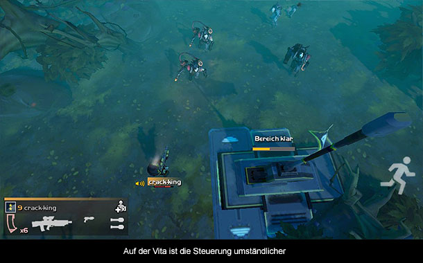 Aber wie bereits erwähnt, erhält man für jeden abgeschlossenen Planeten auch einige Verbesserungen. Denn in „Helldivers“ kann man sich seinen Wunschcharakter dank der vielen freischaltbaren Fähigkeiten und Waffen relativ frei zusammenstellen. Da gibt es unterschiedliche Waffentypen, Aufsätze für die Waffen und auch Hilfsdrops für den Kampf. Beispielsweise kann man im Kampf mit Feinden einen kurzen Luftschlag anfordern, eine unglaublich starke Bombe detonieren lassen oder mal eben ein Fahrzeug oder einen Mech anfordern, um mit diesen dann weiterzukämpfen. Die Möglichkeiten sind riesig und wirklich motivierend. Aber beim Anfordern der jeweiligen Extras muss man aufpassen, denn „Helldivers“ kennt kein Mitleid und ermöglicht Friendly-Fire. Im Kampf könnt ihr also eure Kameraden anschießen und dabei auch töten und die angeforderten Extras werden in Raumkapseln aus dem Weltall auf den Planeten geschossen und wer da nicht aufpasst, wird schnell zerquetscht. Das sorgt für etwas mehr Taktik im Spiel, aber auch für wirklich komische Situationen, wenn ein gerade wiederbelebter Kamerad direkt wieder das zeitliche segnet, weil man nicht aufgepasst hat. Dies ist aber auch der Grund, warum man Helldivers am besten mit ein paar Kollegen und Headset spielt. Mit zufälligen Leuten aus dem Internet kann das Friendly Fire manchmal auch nach hinten losgehen, wenn die Personen an einem ernsthaften Spiel nicht interessiert sind. Auf der Vita ist die Steuerung übrigens etwas gewöhnungsbedürftig. Denn durch die fehlenden R2/L2 Tasten wird das hintere Trackpad mitgenutzt, was des Öfteren dafür sorgt, dass man völlig unbeabsichtigt Granaten wirft. Hier wären ein paar alternative Steuerungsansätze wünschenswert gewesen.