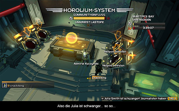 Nachdem ihr euch aber auf eurem Einsatzschiff eingefunden habt, darf der Host eine Mission auswählen. Dazu steht eine Karte der Galaxie zur Verfügung, in derer Mitte die Über-Erde eingezeichnet ist. Die restliche Galaxie ist in die Bereiche der Rassen Bugs, Illuminati und Cyborgs eingeteilt. Aus diesen Bereichen kann man nun Planeten auswählen, die allesamt in unterschiedliche Schwierigkeitsstufen eingeteilt sind. Hat man die Missionen, wie z.B. zerstöre Basis A oder verteidige den Konvoi, auf einem Planeten beendet, gilt der Planet als abgeschlossen und man hat zum globalen Weltkampf beigetragen. Denn neben dem lokalen Spiel gibt es auch eine Art globales Spiel, an dem alle Helldivers teilnehmen. Denn mit jedem Spiel sorgt man dafür, dass der jeweilige Gegner in der Galaxie weiter zurückgedrängt wird. Gleichzeitig kann sich aber auch der Gegner wieder zurückkämpfen, wenn Missionen scheitern. Zudem kommt es hin und wieder zu besonderen Events, wenn z.B. eine Fraktion die Über-Erde angreift, an denen dann ebenfalls alle für einen begrenzten Zeitraum teilnehmen können.