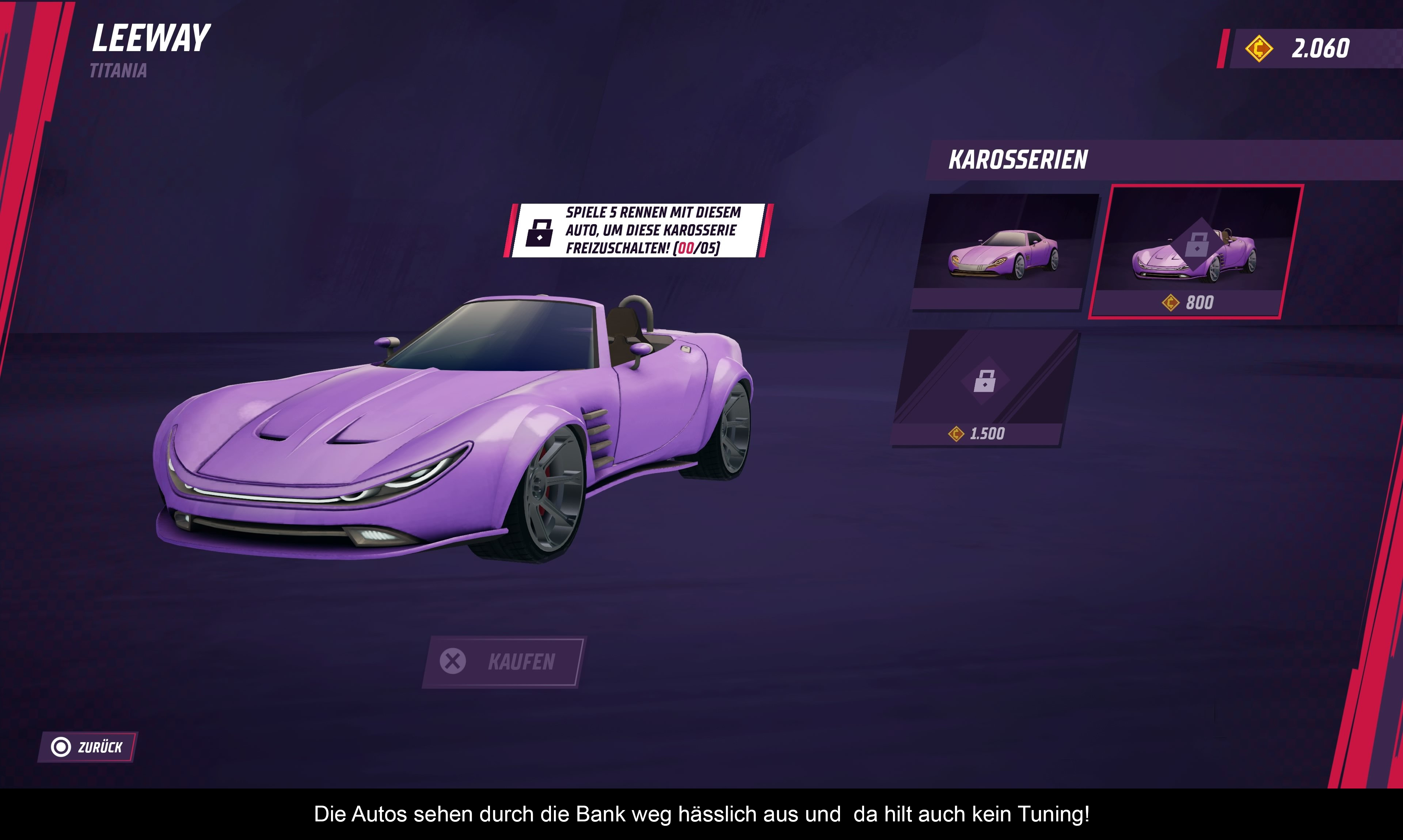 Über den Spielplatz-Modus kann man an wöchentlichen Herausforderungen (z.B. Gewinne das Rennen ohne Nitro einzusammeln) teilnehmen, oder Mehrspieler-Rennen bestreiten. Als Belohnungen winken Geld und spezielle Lackierungen. Die Herausforderungen mixen verschiedene Elemente wie Streckenrichtung, Tageszeit und Wetter zu abwechslungsreichen Events zusammen. Wer sich mit anderen menschlichen Spielern messen will, wird enttäuscht sein. Trotz Cross-Plattform Kompatibilität wurden bei mir niemals andere menschliche Fahrer angezeigt. Die Rennen starten dann einfach mit KI-Autos. Lobbies gibt es auch keine. Immerhin kann man aber auch lokal mit bis zu drei weiteren Spielern um die Wette fahren. Ansonsten ist der Mehrspielermodus aber eine herbe Enttäuschung und äußerst rudimentär gehalten. Davon abgesehen existieren auch noch kurze Kampagnen mit unterschiedlichen Schwierigkeitsgraden, ausgelegt auf maximal 4 Rennen. Die Münzen fehlen komplett, dafür kann man mehr Nitro-Fragmente sammeln. Auch hier winken besondere Skins für erfolgreiches Teilnehmen.