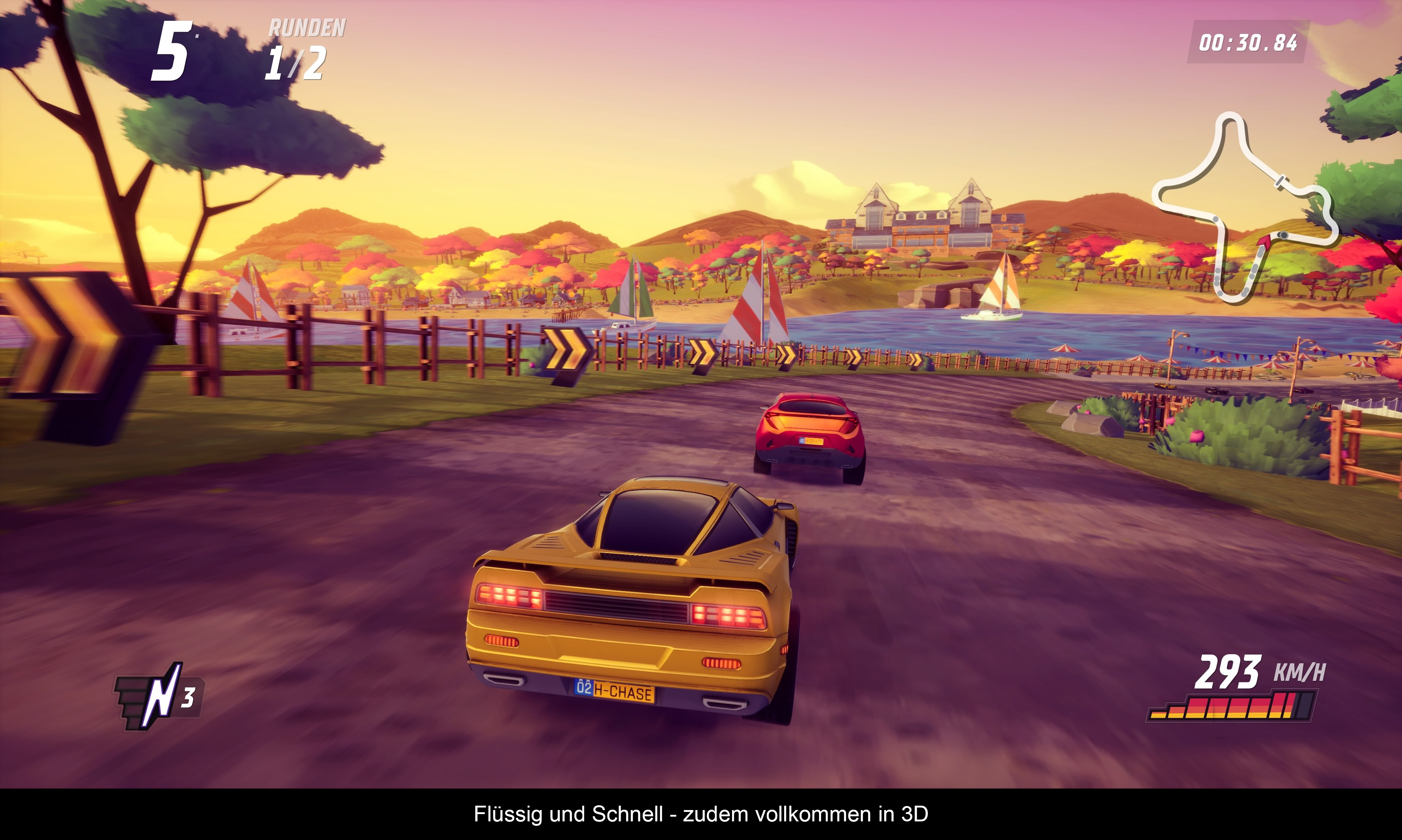 „Horizon Chase 2“ wurde anfangs wieder nur auf dem iPhone / Ipad veröffentlicht (im Rahmen von Apples Abo-Dienst Apple Arcade). Die Herkunft sieht man dem Titel aber nicht an. Erstens da die modernen Geräte eine mächtige Power besitzen und zweitens, da die Unreal Engine gut skalierbar ist. Das Spielgeschehen donnert mit stabilen 60fps über den Bildschirm, lediglich die Bildqualität könnte besser ausfallen. Ein paar „Blitze“ von Pixelkanten machen das Bild deutlich unruhig. Aber im Renn-Rausch fällt das jedoch kaum auf. Der Sound kann dafür nur bei der Musik (wieder von Barry Leitch) punkten. Viele Songs, hochwertiger produziert und arrangiert, sorgen für die passende musikalische Untermalung und versprühen ein ganz eigenes Flair, ohne so dudelig wie im Vorgänger zu wirken. Die restliche Akustik fällt dagegen eher schwach aus und die platten Effekte wollen einfach nicht so recht dazu passen. Einen dicken Minuspunkt gibt es für die fehlende DualSense Unterstützung. Lediglich billigstes Gerüttel wird geboten und kommt man auch nur in die Nähe der Bremse (linker Trigger), dann bremst die Karre gleich mächtig ab.