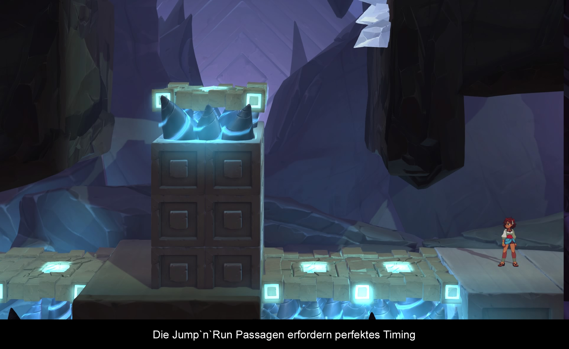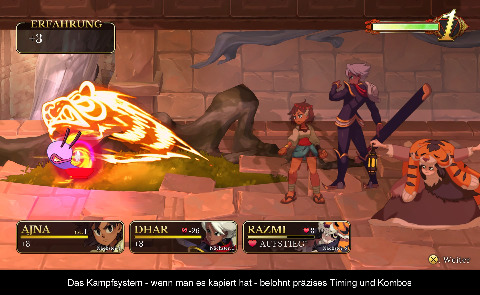 Das Gameplay-Potpourri von „Indivisible” klingt verlockend. Neben Rollenspieleinflüssen wie das aktive Kampfsystem, Erfahrungspunkten und einer richtigen Party, bringt das Spiel gleichwertig auch diverse Jump'n Run Einflüsse mit ein. Wandsprünge, pixelgenaues Sliden und Ausweichen von gegnerischem Beschuss sorgen für Herausforderung und Abwechslung. Dazu kommen noch Inspirationen aus diversen Beat'em Ups. Zum Beispiel ist im Kampfsystem jeder Button mit einer Spielfigur belegt. Spezialangriffe muss man wie Kombos ausführen und Blocken muss man schon genau abpassen. Für sich genommen, sind diese Elemente auch nicht schlecht umgesetzt. Aber zusammen können sie auch viel reichlich Frust sorgen, zumal die Checkpoints mitunter schlecht gesetzt sind und man lange Geschicklichkeitspassagen in einem Boss-Kampf wiederholen kann. Auch ist es nicht so toll, dass – wenn man mal scheitert – man anfangs auch nicht leveln kann. Erst später tauchen einmal besiegte Gegner in den Gebieten wieder auf. Aber dann ist man wahrscheinlich sowieso zu stark bzw. kann durch geschicktes Ausnutzen diverser Fertigkeiten einzelner Charaktere die Schwächen des Spieldesigns gekonnt ausnutzen. Die Balance des Spiels ist eindeutig nicht gelungen und neben einzelnen Anstiegen ist der Anfang per se eher schwieriger als das Ende. Was mich aber am meisten geärgert hat, waren die drakonischen Jump'n Run Passagen im Spiel – mal ehrlich, man kann es auch übertreiben! Und ja, schaff-bar ist alles, aber wer verspürt heutzutage noch Lust und Laune, sich fünfzig Mal an einer einzelnen Stelle zu versuchen. Zumal man sich auch noch an das Steuerkreuz des Dualshock 4 Controllers gewöhnen sollte, denn mit dem Stick hat man bei den Hüpfpassagen (Stichwort Timing) und im Kampf die deutlich schlechteren Karten.