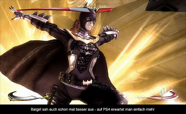 Bei einem Spiel wo es um übermächtige Helden und Schurken geht, darf eine geplante Zerstörungsorgie nicht fehlen. Für die verschiedenen Arenen hat man sehr viel Zeit investiert und diese weisen unterschiedliche Zerstörungsgrade auf. Je weiter der Kampf voranschreitet, desto mehr gehen im Hintergrund Objekte und Gebäude zu Bruch. Auch die Levelübergänge sind nicht minder beeindruckend. Hier wird der Gegner quer durch Arkham Asylum geschleudert oder mal quer durch die Festung der Einsamkeit. Man kann sich immer sicher sein, dass im Hintergrund etwas geschieht. DC Fans werden bei diesen Arenen ihre wahre Freude haben, denn diese sind ohne Ende mit Easter Eggs geschmückt. Doomsday in der Festung der Einsamkeit, Mr. Terrific im Wachturm, Darkseid bei einem Levelübergang und noch viele mehr. Über das Design der Helden und Schurken lässt sich streiten. Supermans neue Speedo ist etwas sehr gewöhnungsbedürftig, dafür glänzt Deathstroke mit einer beeindruckenden Rüstung. Dem einen Spieler wird es gefallen, dem anderen nicht. Einzig bei den Damen dürfte sich jeder einig sein. NetherRealm Studios scheint nicht in der Lage zu sein die weiblichen Geschöpfe richtig zu formen. Wonder Woman gleicht mehr einen Mann als einer Frau. Abseits derDesignschwächen bei den Charakteren gibt es technisch nicht viel zu bemängeln. Trotz der Gewaltorgie im Hintergrund und einer Vielzahl von Objekten auf dem Schirm, stemmt das Spiel ohne Problem 60 Bilder pro Sekunde und 1080p. Natürlich darf man hier nicht außer Acht lassen, dass es sich nur um eine grafisch aufgearbeitet PS3 Version handelt, welche auch schon 60 Bilder pro Sekunde schaffte.