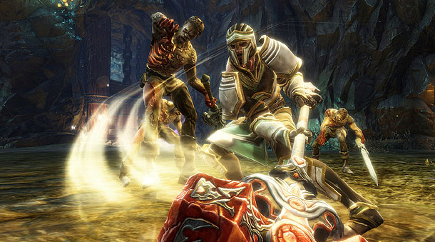 Zuerst steht wie in jedem RPG die Charaktererschaffung auf dem Programm. Es stehen vier Rassen zur Auswahl (zwei menschlich und zwei von den Elfen), die nicht nur das generelle Aussehen, sondern auch die Startfähigkeiten festlegen. Die Anpassungsoptionen der eigenen Figur sind dabei solide, aber keineswegs so erschöpfend wie in Skyrim oder anderen RPGs von ähnlichen Ausmaßen. Wer unterhalb des Halses kreativ werden will, wird leider enttäuscht. Zuletzt entscheiden wir uns noch für unseren Gott, der uns einen kleinen Bonus verleiht und schon geht es ab ins Abenteuer. Eins wird schnell klar: Amalur ist eine riesige, abwechslungsreiche Welt voller Quests, liebevollen Details und mehreren hundert Ingame-Buchseiten voller Geschichten und Informationen. Bereits im ersten Dorf wartet eine Vielzahl von Aufgaben auf den noch grünen Helden. Doch das ändert sich dank der überzeugenden Quests schnell. Reckoning erfindet das Rad des Questdesigns zwar nicht neu, doch bettet einen Löwenanteil von ihnen in amüsante und interessante Geschichten ein. Das gilt vor allem für die langen Questreihen der sechs Häuser, die jede für sich schon länger dauert als ein God of War. Apropos God of War: Mit dem wütenden Griechen verbindet Reckoning nämlich das Kampfsystem. Anstatt wie in vielen RPGs üblich auf ein simples, oft langweiliges Kampfsystem zu setzen, geizt Reckoning nicht mit freischaltbaren Kombos für verschiedene Situationen, die sich sogar waffenübergreifend aneinanderreihen lassen. Das Timing erfordert etwas Gewöhnung, denn es zählt nicht nur die Reihenfolge der Tasten, sondern auch, ob ich darauf herumhämmere oder ein wenig warte nach dem letzten Schlag. Der Höhepunkt ist dabei der aktivierbare Reckoning-Modus, in dem der Kampf in Slow Motion abläuft und besiegte Gegner mittels spektakulärem Finisher ins Jenseits befördert werden. Das alles macht den Kampf erheblich dynamischer als zum Beispiel bei Skyrim und wird auch nach etlichen Stunden nicht langweilig.