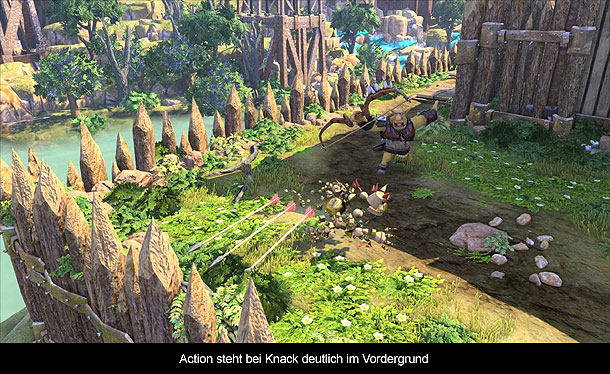 Spielerisch präsentiert sich Knack als Mischung aus Jump`n Run und Brawler, wobei der Brawler Anteil deutlich überwiegt. Dabei verfügt Knack über einen rudimentären Angriff, womit man die Gegner in die Flucht schlagen kann. Mit Hilfe des rechten Analogsticks kann man dann noch ausweichen, was man auch definitiv tun wird. Denn Knack ist selbst auf den niedrigeren Schwierigkeitsgraden mehr als fordernd und stellenweise fast unfair. Das liegt daran, dass man es nur ganz selten mit einem Gegner zu tun hat und je nach Kombination müssen Angriff und Verteidigung perfekt abgestimmt werden. Wer getroffen wird, muss dann meist das zeitliche segnen und nochmals antreten. Besonders ärgerlich ist dies, weil man meist drei bis vier Gegnergruppen erledigen muss, bevor ein Checkpoint erreicht wird. Hier kann es also gerne mal zu Frustmomenten kommen, wenn man wiederholt bei der letzten Gegnergruppe erledigt wird. Glücklicherweise kann man sich in kniffligen Situationen mit Sonnensteinen behelfen. Knack kann nämlich die Energie der Sonnensteine aufnehmen und die Kraft dann in verheerenden Angriffen verteilen, in dem er zum Beispiel eine Art Tornado mit seinen Relikten bildet oder ganze Reliktkugeln auf Gegner feuert. Natürlich muss der Einsatz dieser Fähigkeiten mit Bedacht gewählt werden, da Sonnensteine nicht überall zu finden sind und man erst genug Energie gesammelt haben muss. Man kann sich aber auch durch Relikte helfen, da diese Knack wachsen und stärker werden lassen, wodurch anfangs knifflige Gegner zu leichten Häppchen werden können. Leider kann man bei Treffern die Relikte wieder verlieren und meist wird vom Spiel selbst die Größe bestimmt, indem man an bestimmten Punkten wieder Relikte für ein Rätsel oder ähnliches abgeben muss. Trotzdem ist es mehr als cool, wenn man mit einem Hochhaushohen Knack gegen Panzer und andere Gefahren kämpft und alles plättet. Ebenfalls cool ist, dass man auch andere Materialien als die Relikte aufsaugen kann, wodurch Knack plötzlich einen Eispanzer erhält oder dank Holzmantel Feuer fangen kann. Leider werden auch diese Stellen vom Spiel strikt vorgegeben und bis auf mehr Leben bzw. Kraft haben sie kaum Einfluss auf das Spielgeschehen. Hier hat man viel Potenzial mit möglichen Rätseln oder Kombinationen von Kräften verschenkt. Ähnliches gilt für den Jump`n Run Anteil des Spiels. Dieser kommt nur ganz selten vor und das ist im Grunde auch gut so, da vor allem das Springen ziemlich hakelig von statten geht und man teilweise mehrere Versuche braucht, um auf einen kleinen Vorsprung zu kommen. Wenn dann dadurch auch noch ein Gegner einen Treffer landen kann, wird es schnell extrem frustrierend und das obwohl Knack auch so schon extrem schwer ist. Glücklicherweise kann man das Spiel auch im Co-op Modus spielen, wobei der zweite Spieler dann eine Metallkopie von Knack steuert und dem ersten helfen kann. Leider funktioniert dieser Modus nur an einer Konsole und nicht übers Internet. Toll ist hingegen, dass man während des Spiels zahlreiche Dinge in versteckten Ecken einsammeln kann, die auch Auswirkungen aufs Spiel haben. Denn je mehr Gegenstände man findet, desto mehr Gerätschaften kann man bauen, die einem dann das Spiel etwas erleichtern.