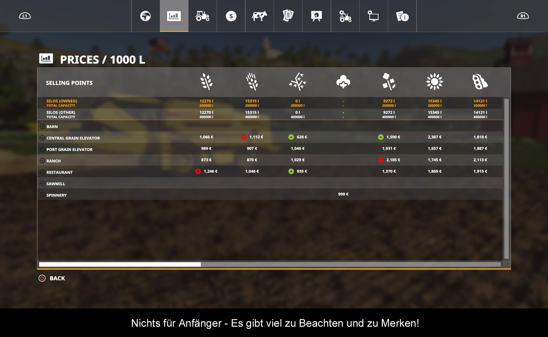 Das Spiel begrüßt einem zunächst erstmal mit einem action-geladenen CGI-Intro, wo die Landwirtschaft als atemberaubendes Abenteuer präsentiert wird, inklusive wilder Traktor-Wettrennen. Doch wie man schon im Hauptmenü feststellen wird, ist der tatsächliche Ablauf viel - vieeeeeel – gemächlicher. Zunächst bietet einem Landwirtschafts-Simulator 19 drei verschiedene Spiel-Varianten an, die jeweils für verschiedene Schwierigkeitsgrade stehen. Während man als motivierter Bauer entweder von null anfangen kann – also ohne Land und ohne Maschinen, aber dafür mit reichlich Geld – empfehle ich Neueinsteigern wie meine Wenigkeit, den vorangeschrittenen Modus auszuwählen. Hier bekommt man von Beginn an nicht nur seine eigene Farm vorgesetzt, sondern auch kleines aber feines Tutorial. Landwirtschafts-Simulator 19 ist bekannt dafür, unzählige Einstellungsmöglichkeiten und Optionen zu bieten. Aus diesem Grund ist es empfehlenswert, sich zunächst einmal mit den Grundlagen des Spiels zu beschäftigen. Dies umfasst das Ernten von Produkten, das Sähen von Samen, das Bearbeiten der Felder als auch den Transport eurer Waren. All dies und mehr erlernt man zu Beginn des Spiels. Obwohl das Anfangs-Tutorial einen recht gut Job macht, muss ich jedoch zugeben, dass ich mich kurz danach etwas alleingelassen gefühlt habe. Während andere Games mit viel zu langen Tutorials nerven, hätte ich nichts dagegen, wenn dieser Bereich hier etwas umfangreicher wäre. Landwirtschafts-Simulator 19 besitzt haufenweise Features, die man jedoch größtenteils selber herausfinden und anwenden muss. Und das ist sicherlich nicht jedermanns Sache.