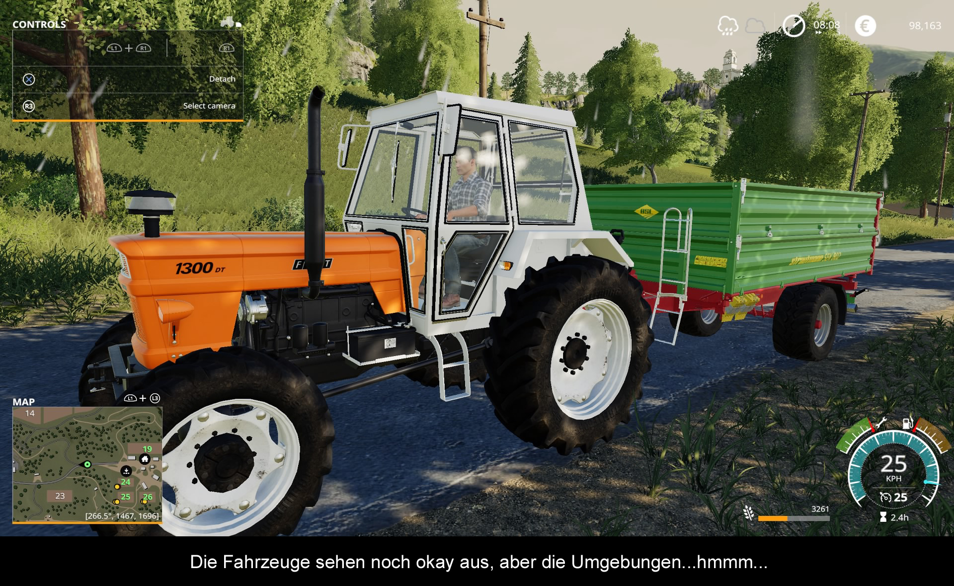 Es ist allgemein bekannt, dass Simulator-Spiele normalerweise nicht über die beste Grafik verfügen. Spiele wie Spintires: MudRunner haben jedoch in jüngster Vergangenheit gezeigt, dass sich nicht jeder Entwickler mit diesem Stigma zufriedengeben will. Und auch der Landwirtschafts-Simulator 19 kann sich durchaus sehen lassen. Zwar sollte man keine atemberaubende Open-World a la Horizon oder Far Cry erwarten, aber dennoch ist das Gesamtbild für einen Simulator recht zufriedenstellend. Einzig die Landschaftstexturen sind hier und da etwas niedrig aufgelöst, und auch die verschiedenen Skyboxen könnten etwas ansprechender aussehen, aber immerhin gibt es abgesehen vom Start keine längeren Ladezeiten zu vermelden. Auch die Wettereffekte sind recht gelungen und tragen erheblich zur Atmosphäre bei. Was ich mir persönlich gewünscht hätte wäre etwas mehr Fußvolk auf den Straßen, da die Umgebungen recht leer und einsam wirken. Ein großes Lob verdienen jedoch die vielen verschiedenen Fahrzeuge, die wie eingangs erwähnt allesamt offiziell lizenziert sind, und ihren Vorbildern sehr ähnlich aussehen. Missfallen haben mir hingegen die viel zu kleinen Texte. Während dies auf dem PC sicherlich akzeptabel ist, hatte ich von der Couch aus immer wieder meine Mühe alles genauestens lesen zu können. Zum Sound möchte ich abschließend noch sagen, dass dieser wie so oft bei Spielen dieser Art nicht wirklich auffällig ist. Immerhin klingen die Motoren- und Umgebungsgeräusche recht gut und laut.