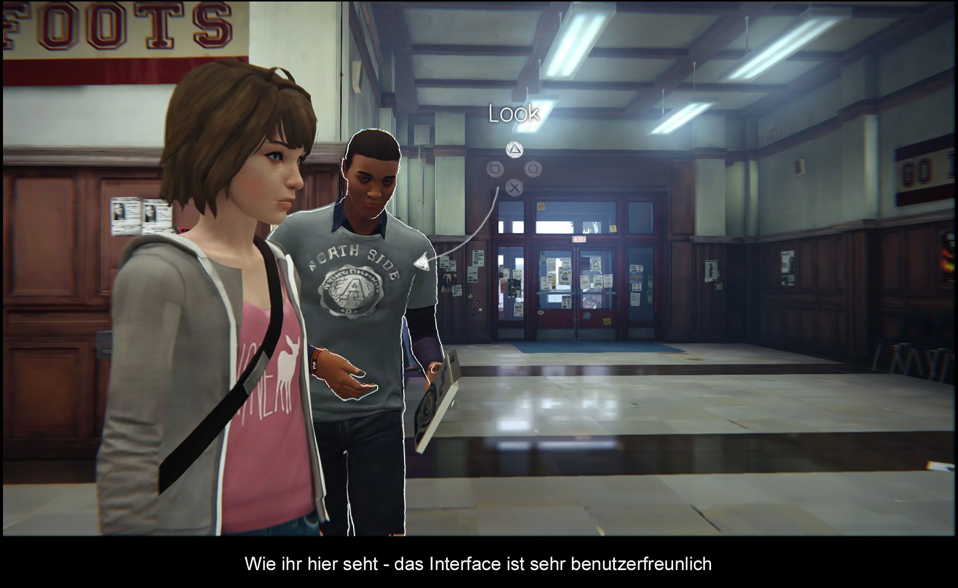 Die Steuerung geht übrigens leicht von der Hand. Blickt man in eine Richtung, werden interessante Objekte weiß umrissen. Diese kann man dann in Ruhe studieren. Wichtige Personen / SMS / Infos werden auch noch in einem integrierten Journal festgehalten. Ansonsten erinnert alles an ein typisches Action-Adventure. Grafisch kann der Titel mit einer gelungenen Eleganz punkten, die durch die warmen Farben und tollen Figuren nicht zu realistisch wirkt, aber auch nicht zu comichaft. Optimal – würde ich sagen. Lediglich das typische Aufploppen von Texturen bekommt man durch den Einsatz der Unreal Engine 3 auch hier zu sehen. Ein besonderes Lob verdient dagegen der Soundtrack, der die Stimmung hervorragend unterstreicht und mit einigen tollen Pop-Songs aufwartet. Die englischen Sprecher verrichten dagegen eher mäßig ihren Job. Gerade Max klingt nicht nach einem schüchternen 18jährigen Mädchen. Einen großen Daumen nach unten bekommt „Life is Strange“ dagegen für die fehlende Lokalisierung. Nicht einmal deutsche Untertitel gibt es und das in Zeiten, in denen fast jeder Indie-Entwickler seine Games in Deutsch anbietet. Zumal auch noch mit Square Enix auch noch ein großer Publisher hinter diesem Projekt steht.
